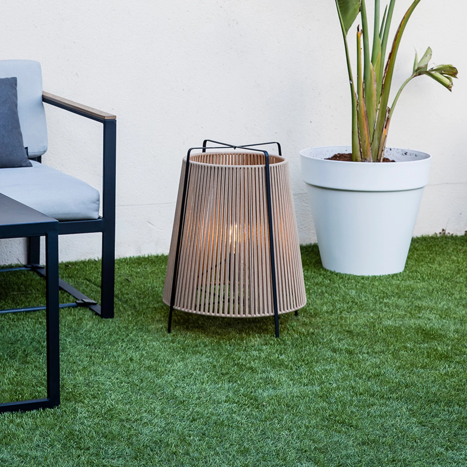 Inspireret af Orienten, skabt i Spanien af designeren Pepe Llaudet: Med sin filigranformede skærm, der er lavet af individuelle strimler, og sit overordnede udseende bringer Akane-terrasselyset charmen fra fjerne lande direkte ind på terrassen derhjemme. Den er beskyttet mod stænkvand og er derfor velegnet til brug i beskyttede udendørs områder. Selv når den er slukket, gør den naturligvis en lige så god figur indendørs som et dekorativt designelement. Den understøttes af en ramme af mat sort stål, hvori E27-fatningen til en LED-pære i retrofit-format er monteret, og den har et 5 meter langt tilslutningskabel.