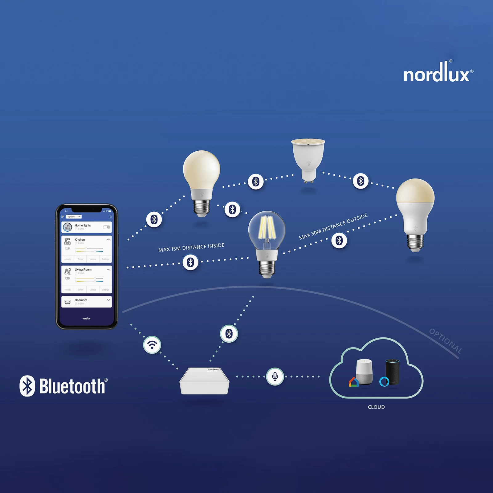 Wifi Bridge til Nordlux Smart Light-produkter (EU-version) med to E27 glødepærer Smart Bridge udvider funktionerne og indstillingerne for Nordlux Smart-produkterne. Armaturerne og pærerne styres via Bluetooth-netteknologi. Via Bridge er det muligt at konfigurere tidsplaner og programmer, at styre lyset i dine egne fire vægge fra et hvilket som helst sted og at aktivere en tilstedeværelsessimulering, når du f.eks. er på ferie eller på arbejde. Desuden kan armaturerne også styres med stemmen takket være Bridge. Nordlux Smart-artikler er kompatible med stemmeassistenterne Amazon Alexa og Google Home.- Tilslutter Bluetooth Mesh til WLAN- Stemmestyring med Amazon Alexa eller Google Home- Indstillinger kan deles med andre brugere- Leveres med to E27-pærer i glødetrådsoptik