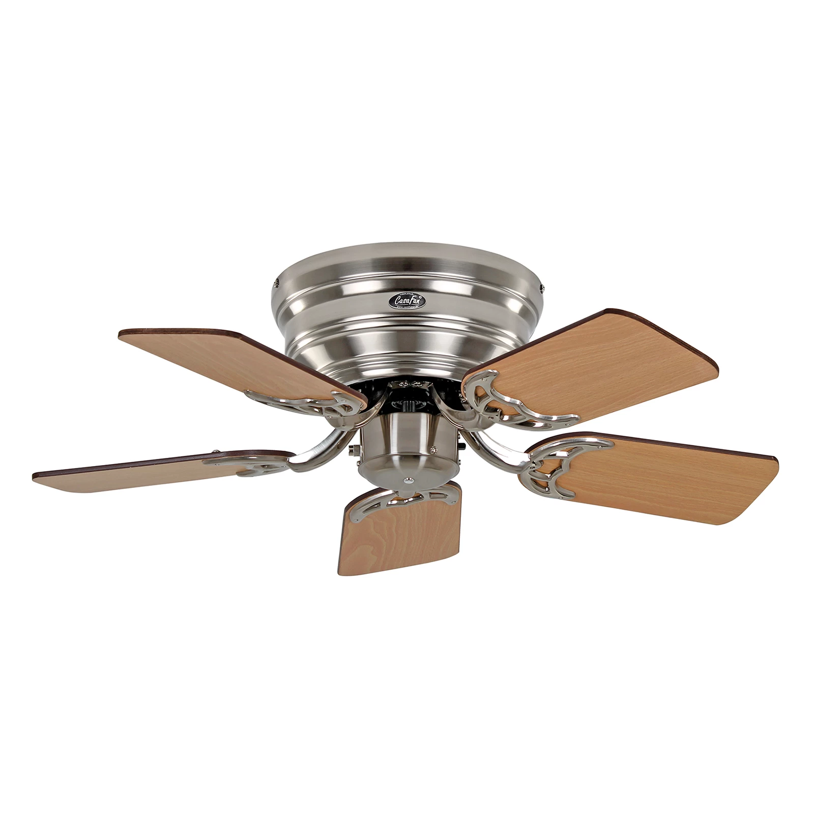 Klassisk Flat III loftventilator – hus i børstet krom, vendbare blade i valnød / bøg
