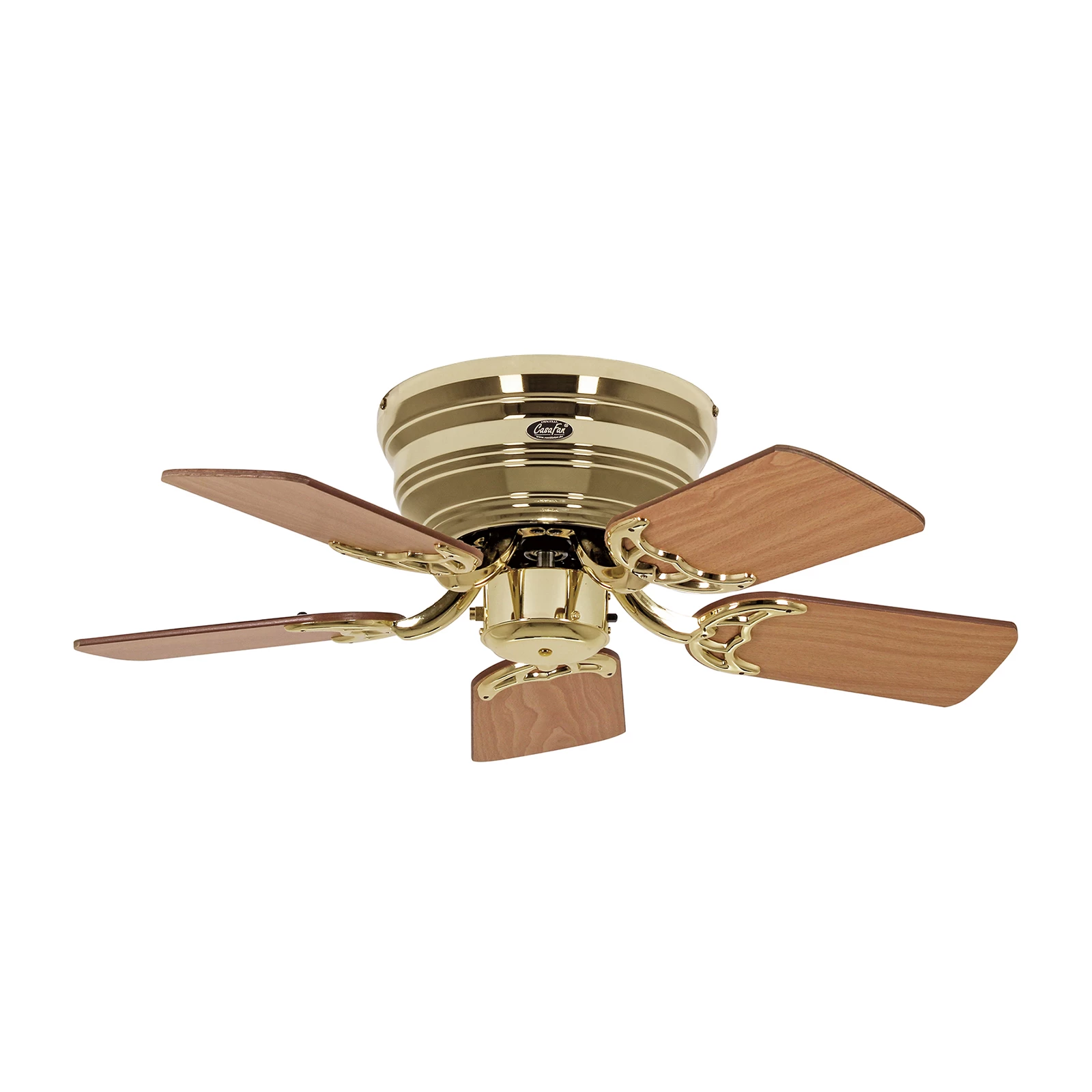 Denne loftventilator er ideel til værelser med lave lofter på grund af dets flade design. Med sit design og metalhuset i et poleret messingudseende sikrer det vintage charme med et ædelt touch. De fem træblade kan drejes og efter ønske orienteres med siden i gammel eg eller ahorn kigge nedad.