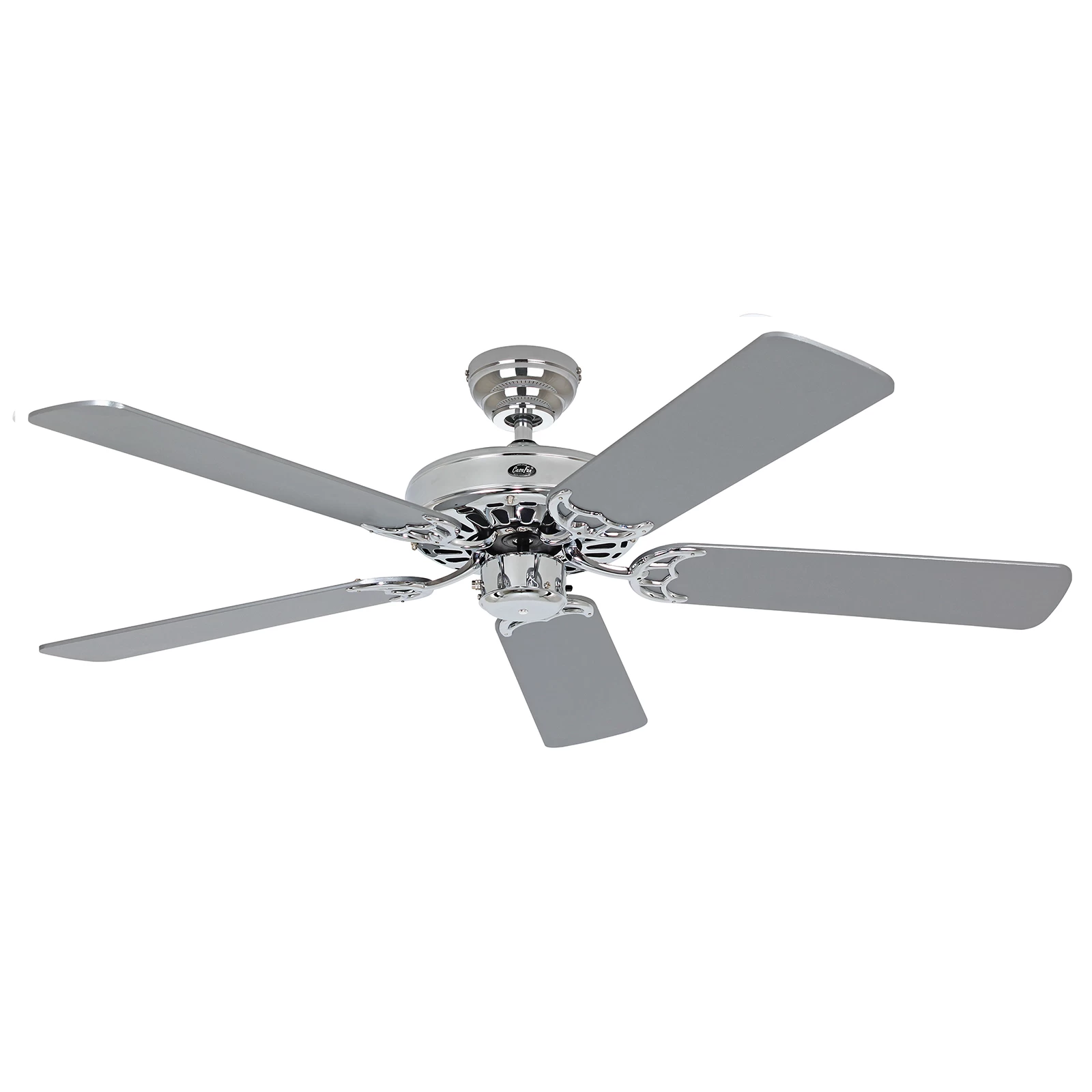 Klassisk Royal loftventilator – hus i blank krom, vendbare knive malet hvid / lysegrå