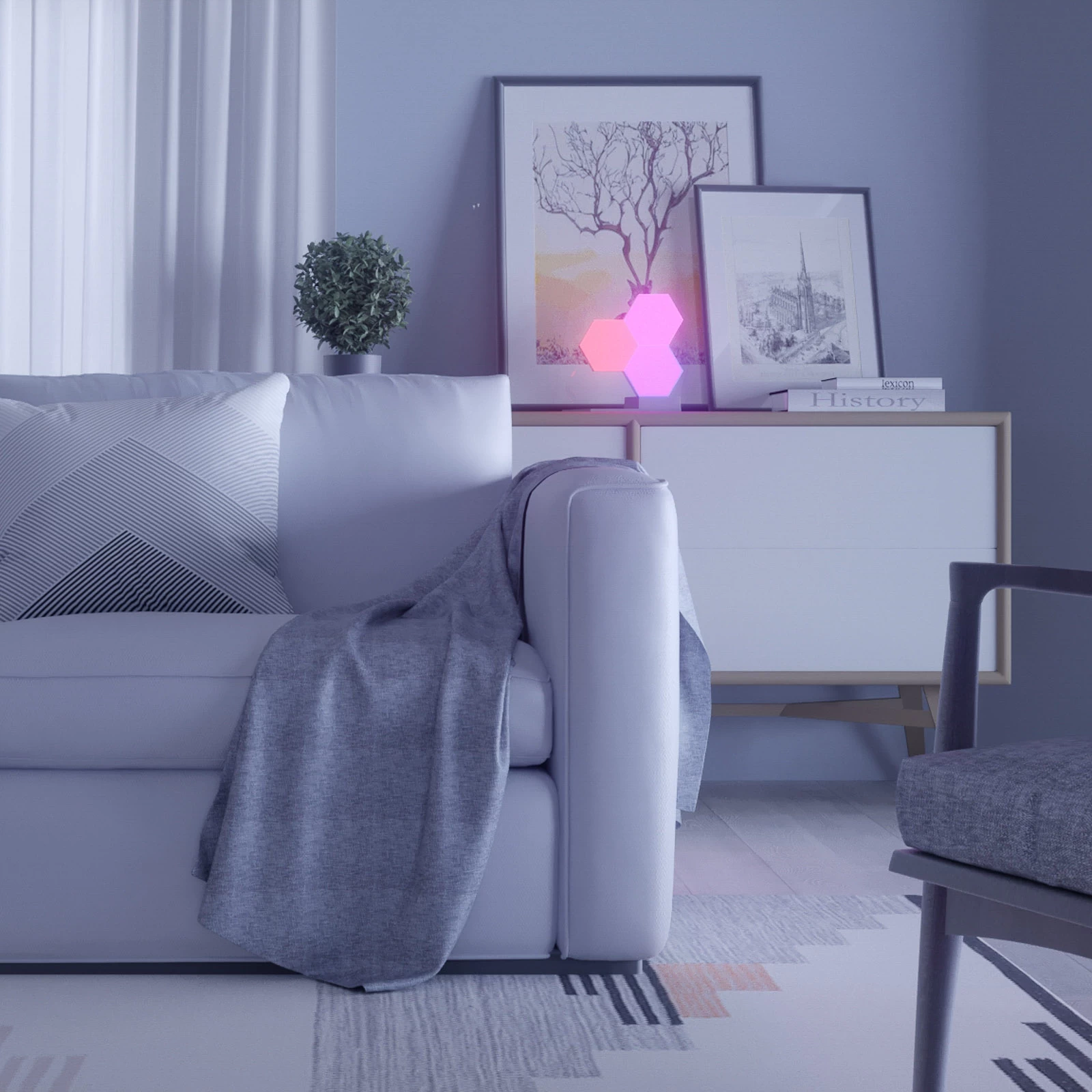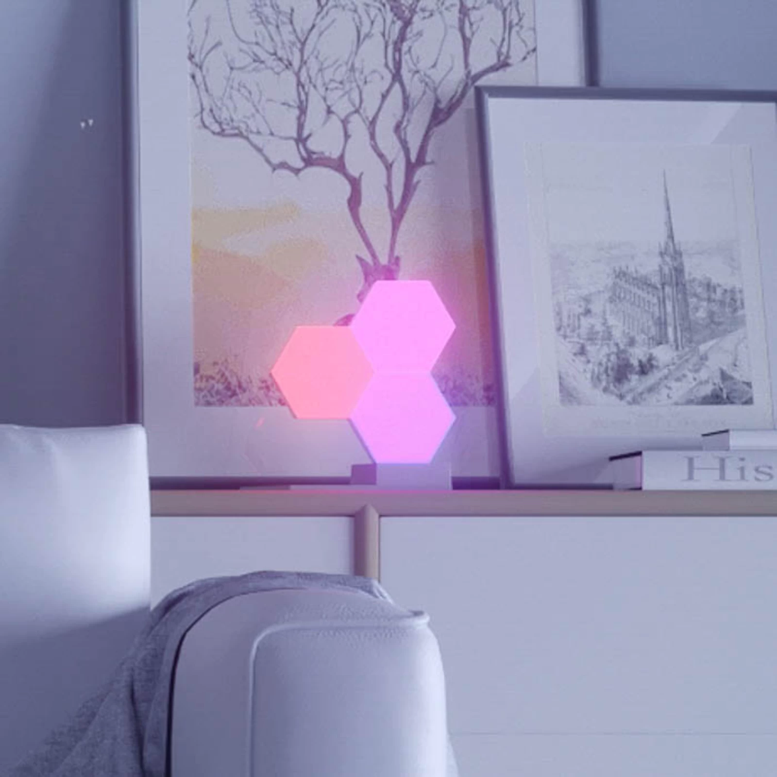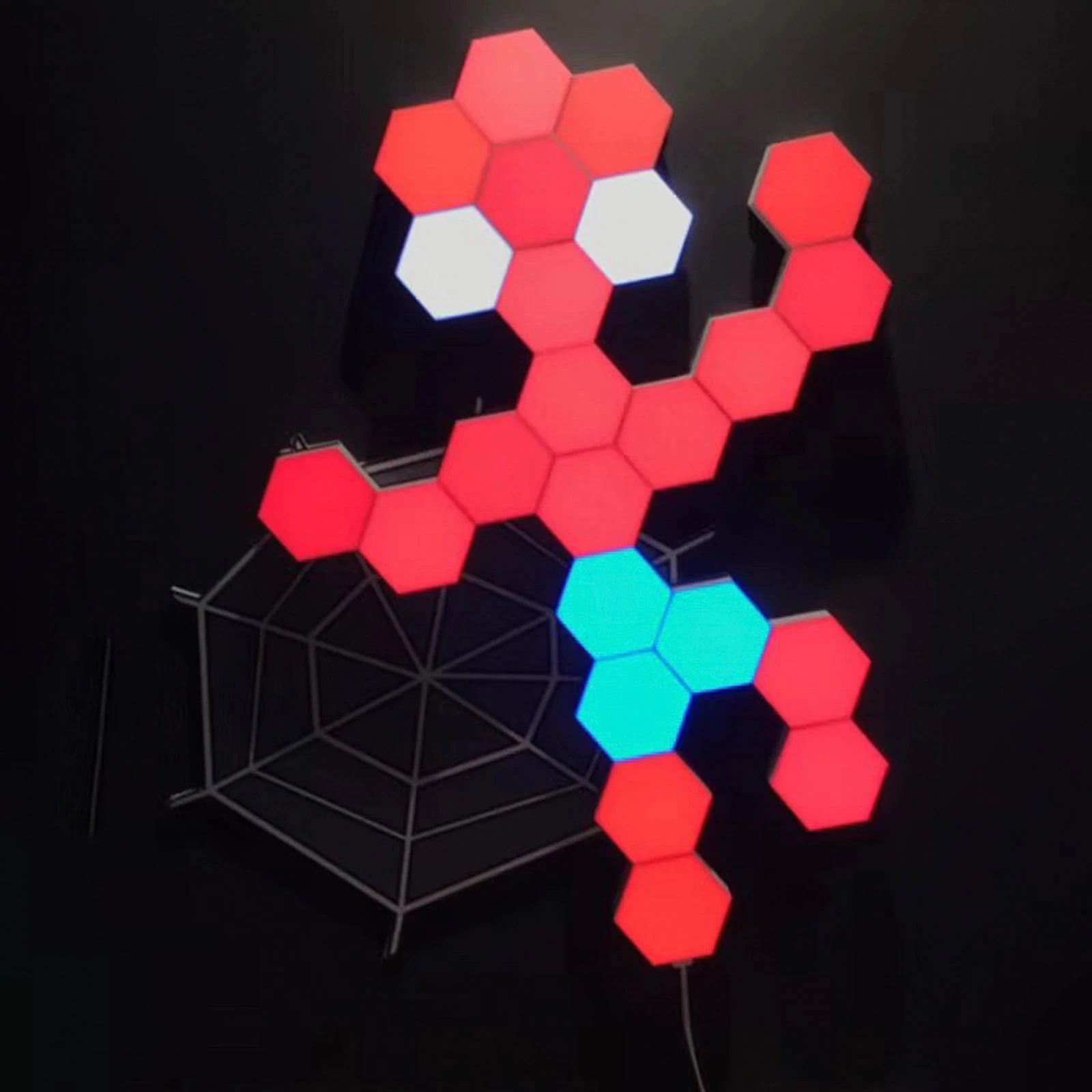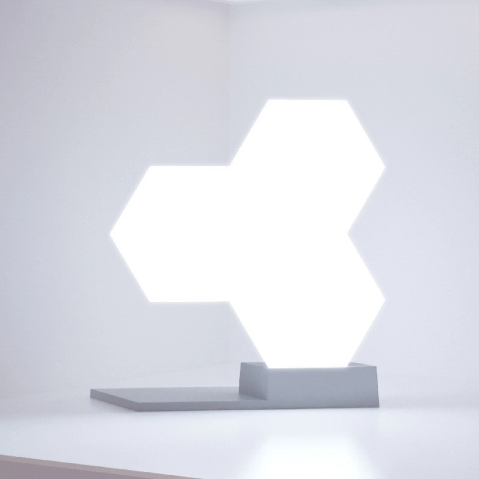 Det hvide, sekskantede modul tilknyttes til andre moduler med det medfølgende samlingsstykke og kan således integreres i forskellige scenarier. Det er også muligt at styre direkte på modulet via en berøringsknap på bagsiden. Strømforsyningen leveres via tilstødende moduler eller hovedstyreenheden på andre sæt, der fås separat.