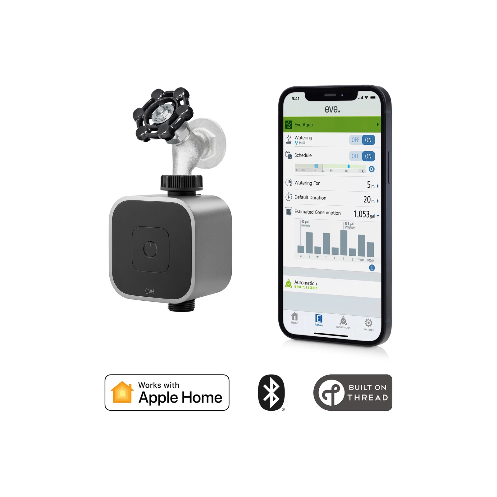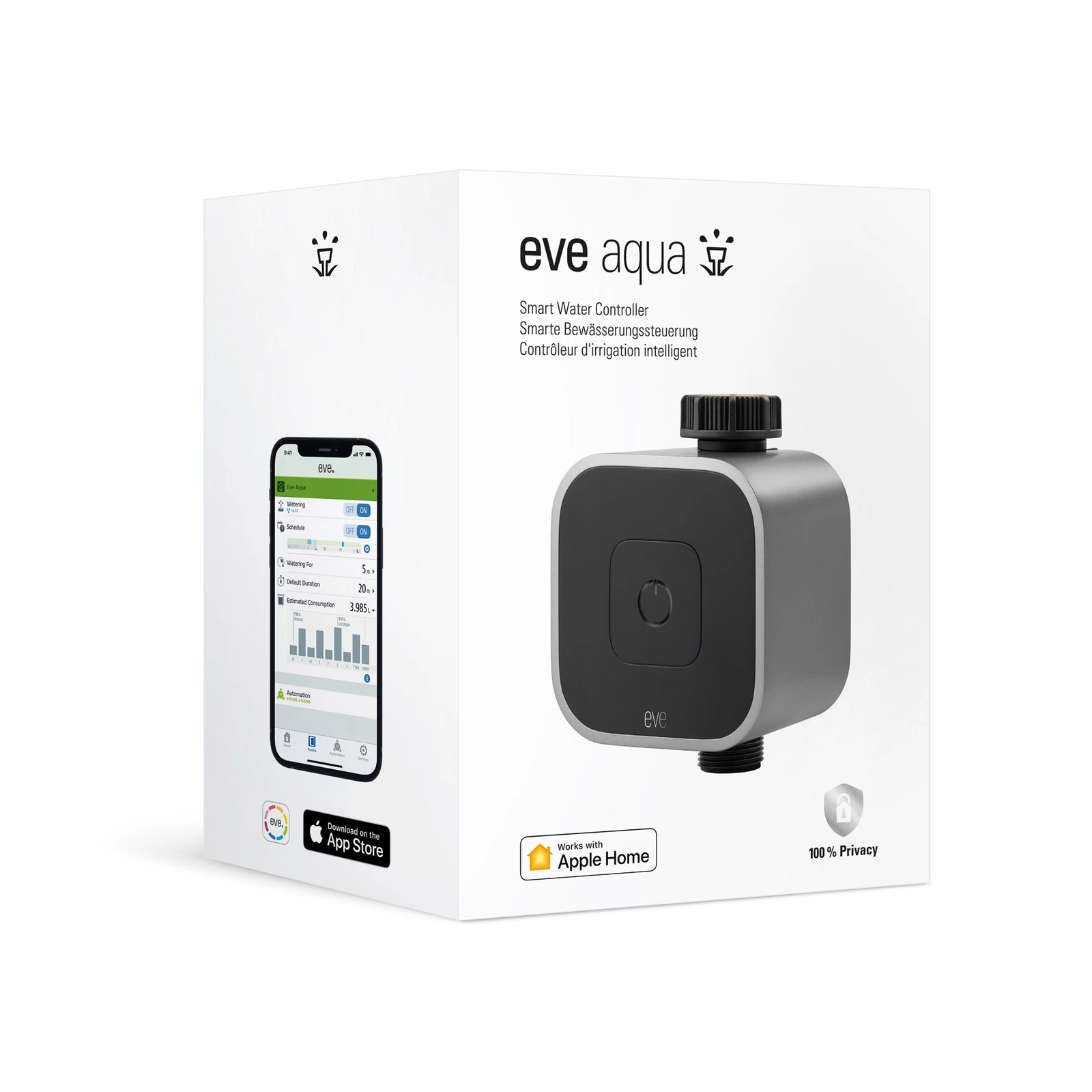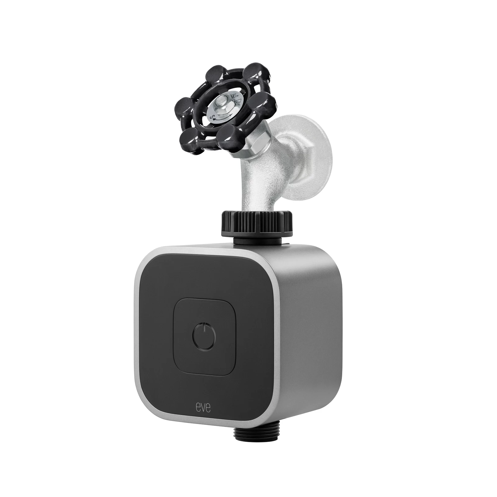 Eve Aqua – App-styrbar udendørs vanding, trådaktiveretDen praktiske Eve Aqua-controller forvandler den udendørs vandhane til et moderne vandingssystem. Eve Aqua skal blot installeres mellem vandhanen og slangen og regulerer vandforsyningen i henhold til forudindstillede tidsplaner. For at gøre dette kommunikerer Aqua med iPhone eller iPad via Bluetooth. Individuelle tidspunkter for vanding kan programmeres i den gratis Eve-app. Når indstillingen er lykkedes, er det ikke nødvendigt at oprette forbindelse til iPhone, vandingstiderne kører automatisk. Til manuel styring har Eve Aqua også en knap direkte på enheden. Meget praktisk er dokumentationen af vandforbruget, som til enhver tid kan ses i app’en. Det er også muligt at starte vandingen med en stemmekommando via Siri. Fjernstyring af systemet og brug af scener er dog kun muligt, hvis Eve Aqua er integreret i et eksisterende Apple HomeKit, og der er garanti for brug af en HomePod eller Apple TV. Funktioner/kompatibilitet:- kan styres med Eve-appen eller Home-appen i Apple HomeKit med aktuel iOS-version- til automatisering og fjernadgang kræves et Apple TV eller en iPad konfigureret som kontrolcenter med aktuel iOS-versionTekniske data:- gevind: 26,5 mm- tryk: min. 1 bar / max. 5 bar- radioforbindelse: Bluetooth Low Energy, tråd- Vandafvisende (IPX4) og UV-bestandigBemærk: Kun kompatibel med Apple-enheder, kan ikke bruges med Android