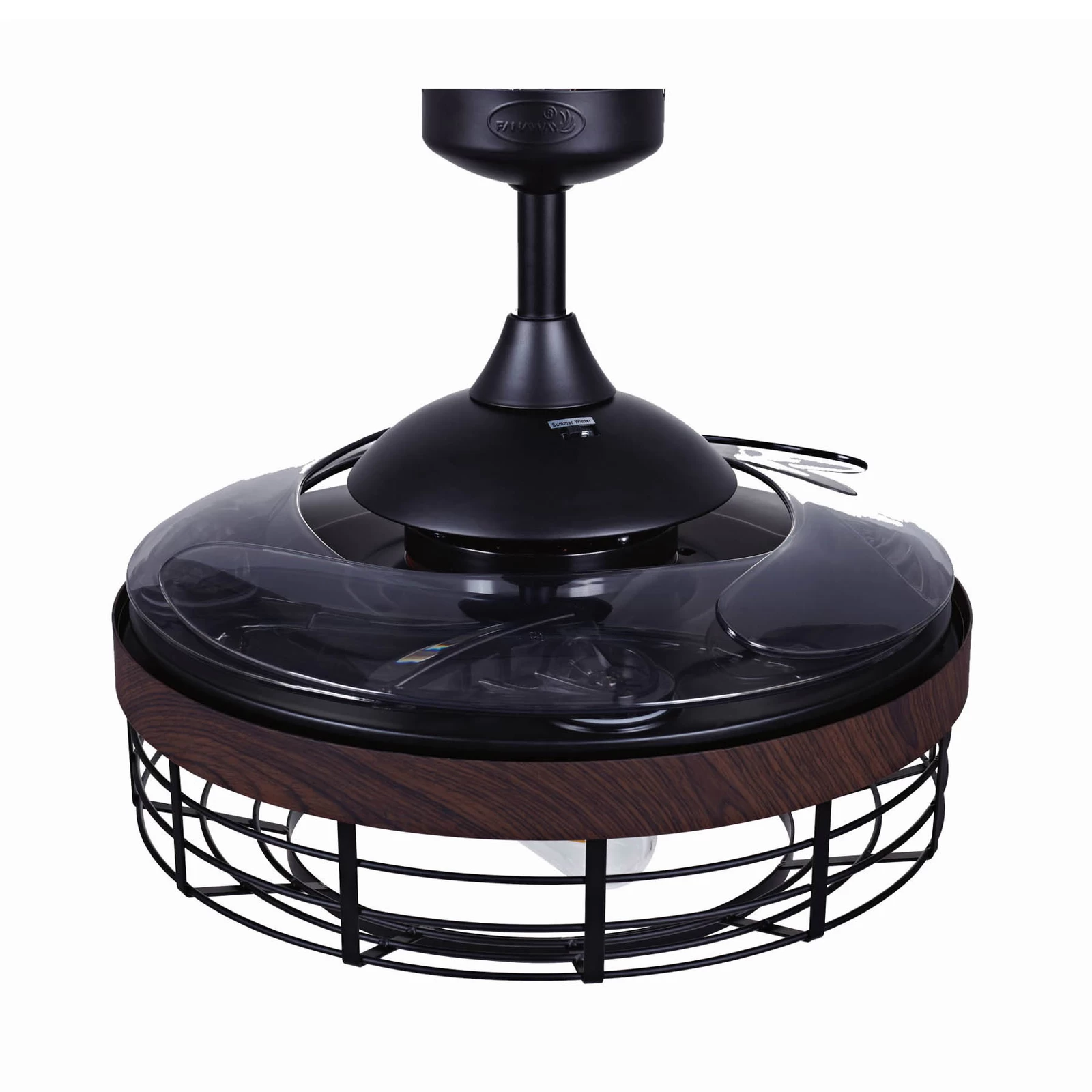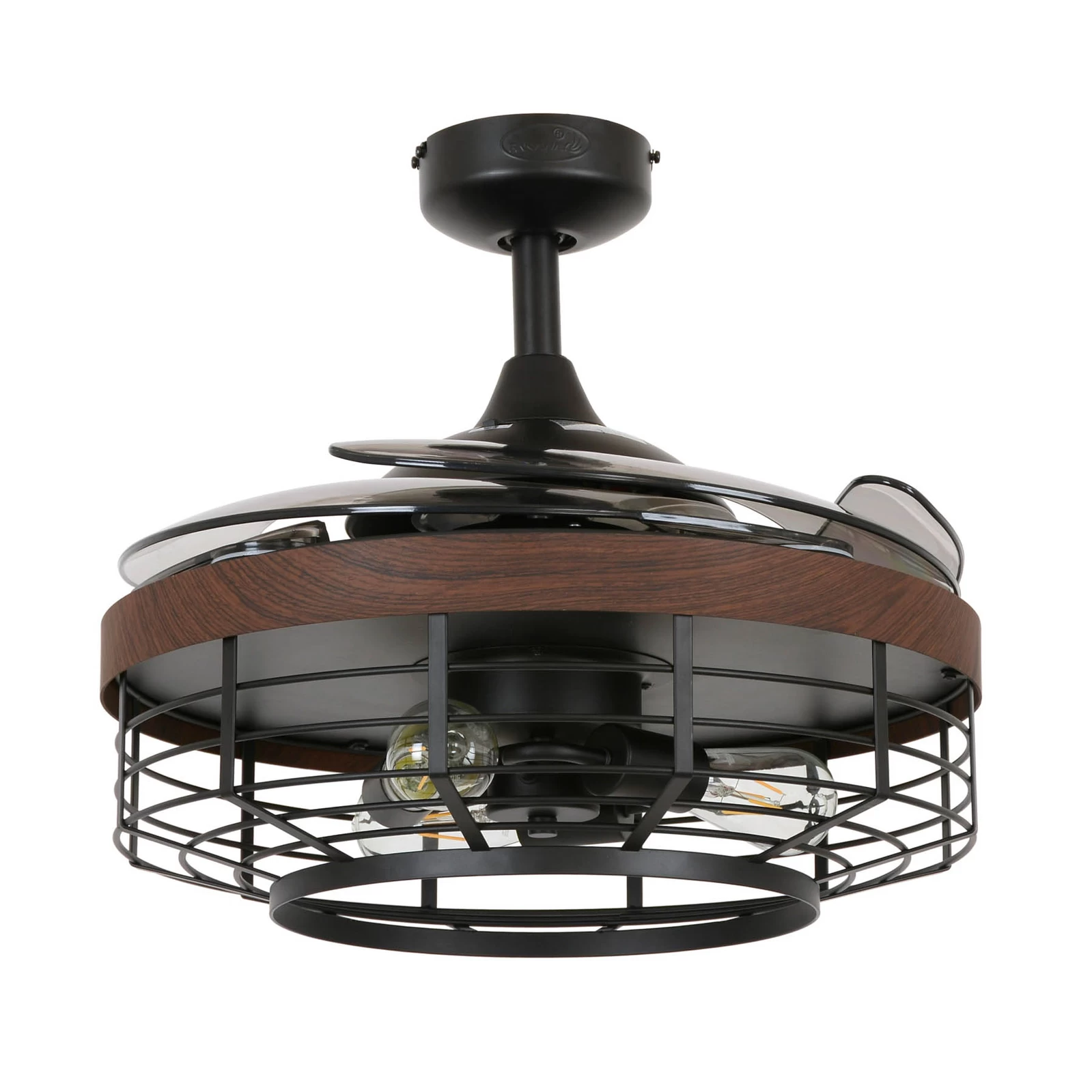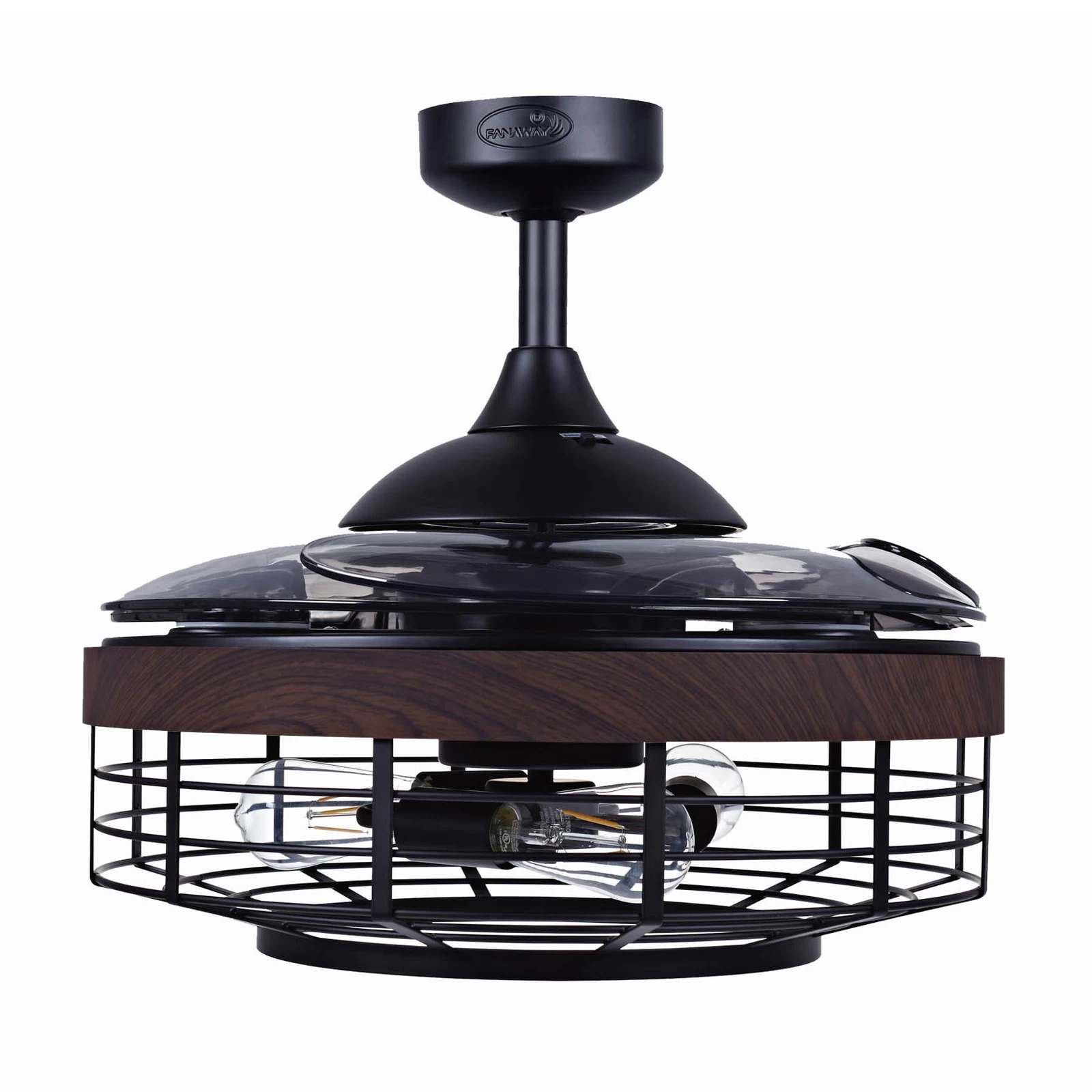 Den firebladede loftventilator Fanaway Montclair med LED-belysning har et trendy bur-look. De gennemsigtige akrylvinger kan nemt foldes ind, når ventilatorfunktionen ikke er i brug. Inkl. LED-pære med E27 sokkel og fjernbetjening.