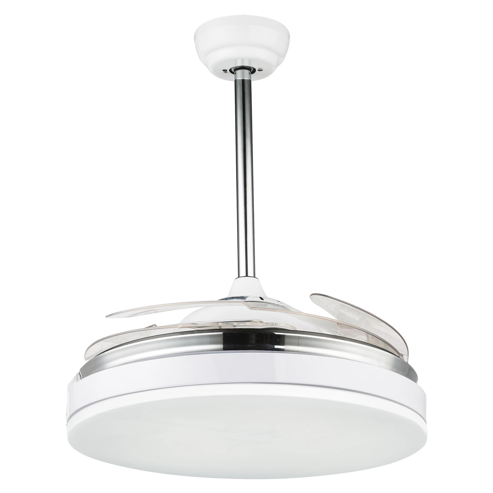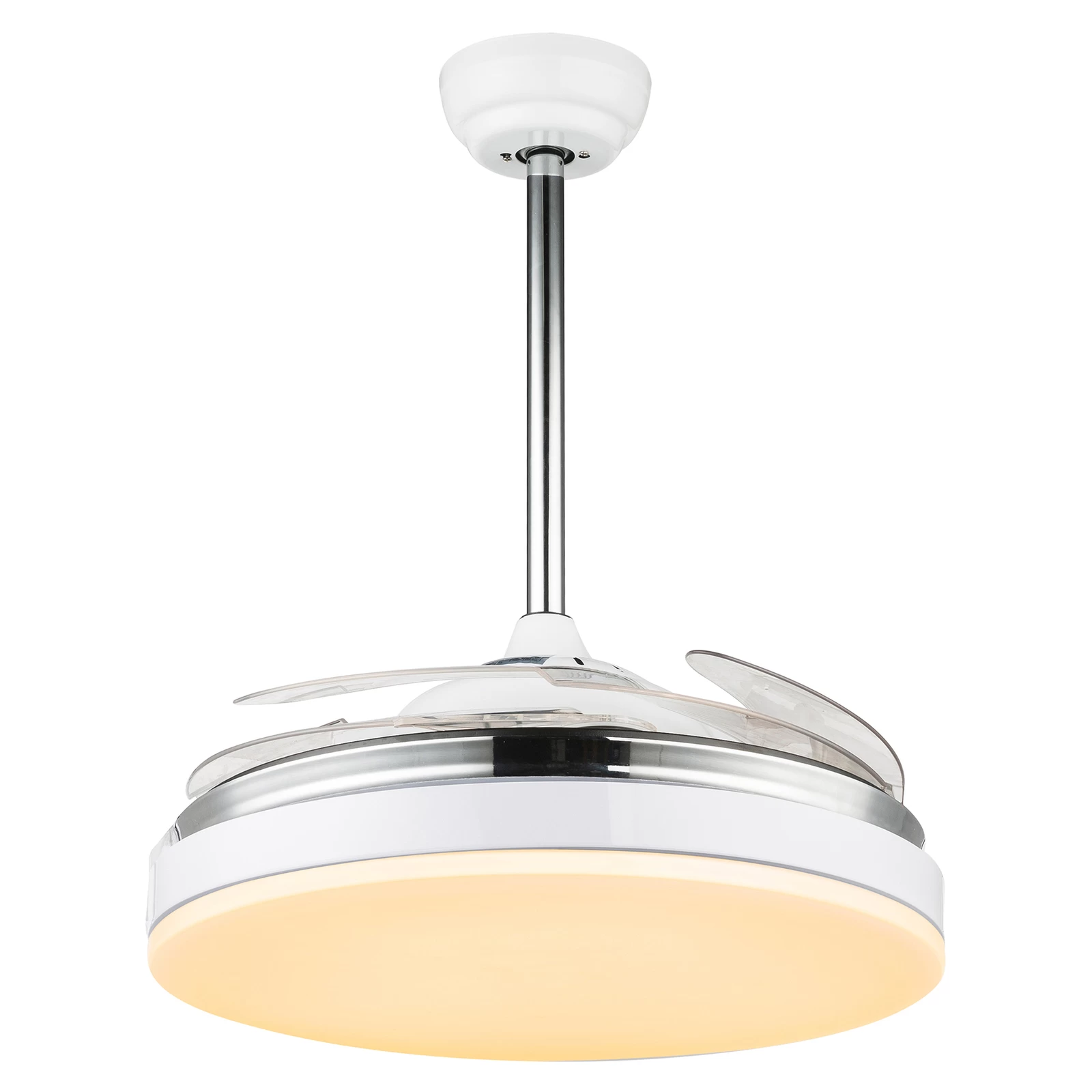 Den moderne LED-loftventilator Cabrera imponerer med sit nuværende design: de fire knive kan foldes ind, når ventilatorfunktionen ikke er i brug. lysfarve på lysdioderne kan ændres og fastgøres via den medfølgende fjernbetjening . Det varme hvide lys er velegnet til en hyggelig sammenkomst. Hvis mere præcis belysning er påkrævet, kan også vælges universel hvidt lys eller lysfarve dagslys. Det satinerede dæksel sørger altid for ensartet lysfordeling uden blænding.
