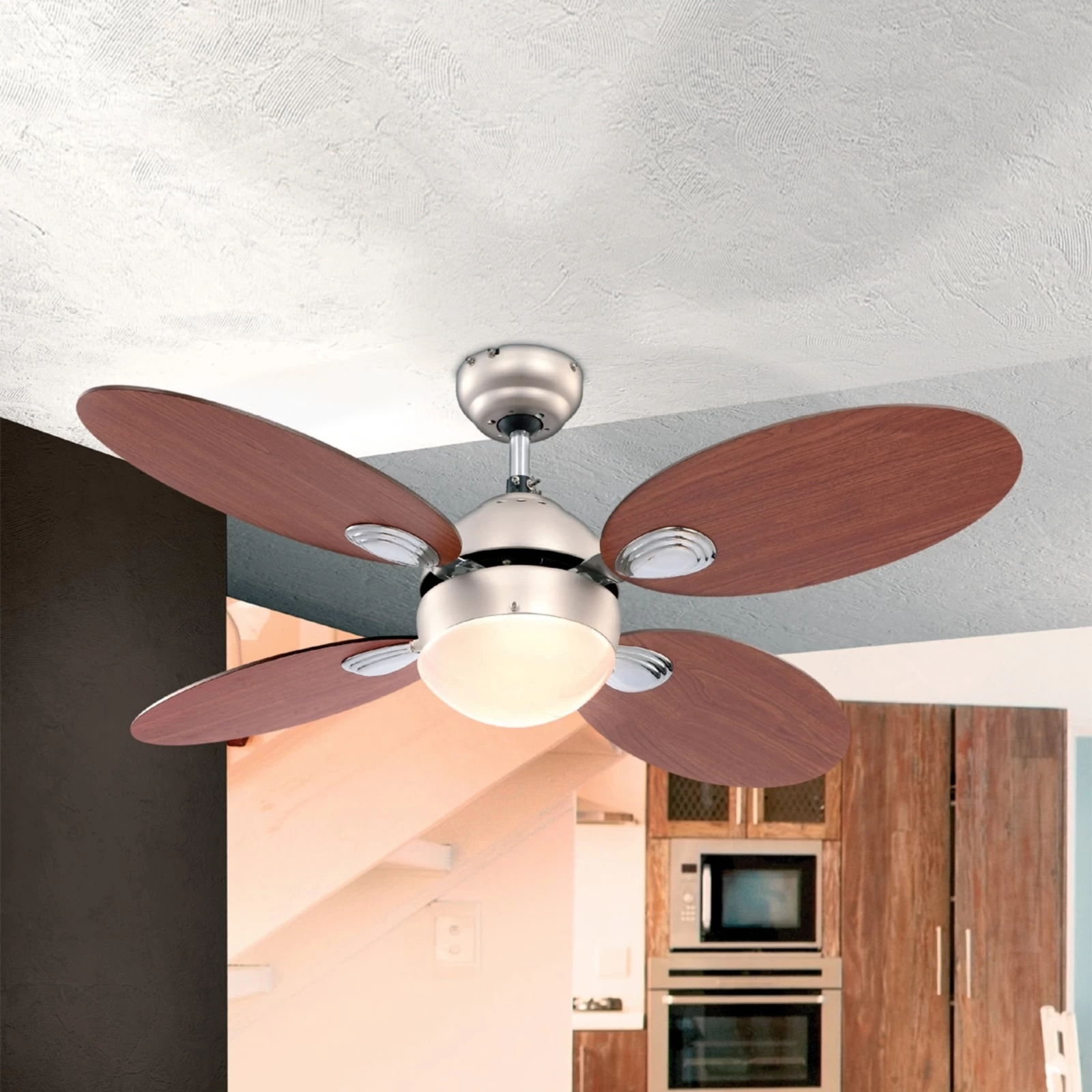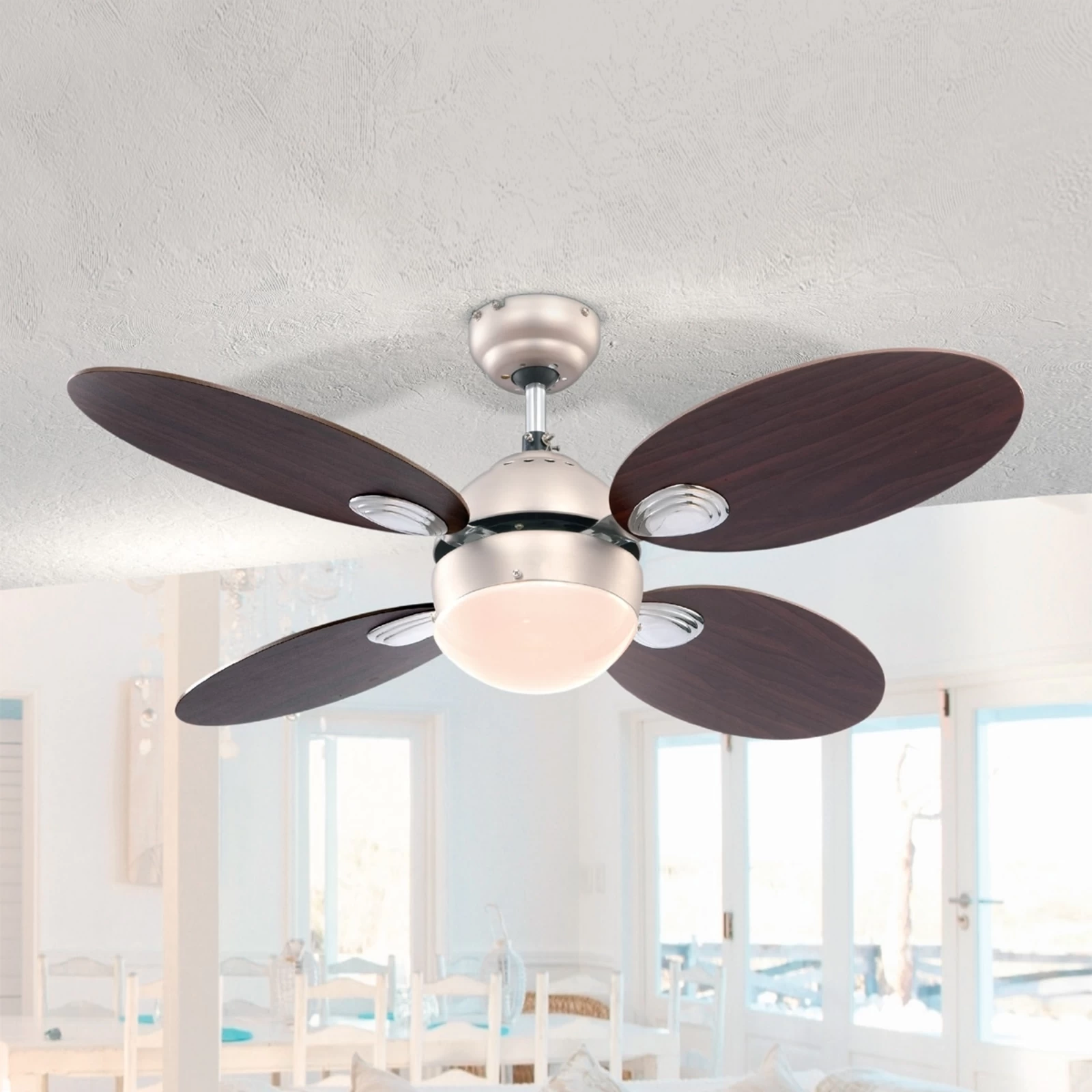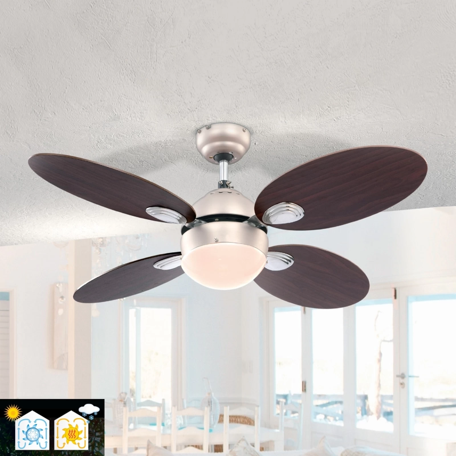 Loftventilatorens design med belysning virker samlet set rundt, da de ovale rotorblade og spottens halvrunde glas samlet set producerer en afrundet virkning. Efter ønske vendes ventilatoren i to mulige retninger til at svale, desuden råder den over en sommer- og vinterindstilling. Snoretræk muliggør at den tændes bekvemt. Om sommeren bliver der herigennem ikke kun behageligt svalt – om aftenen produceres samtidigt en venlig belysning, som skaber en behageligt afdæmpet lysstemning. På vinterindstillingen fordeler ventilatoren den varme luft jævnt i rummet og hjælper på den måde med at spare varmeudgifter. Det fløjelsagtige, satinerede glas er omkranset af metal med et enkelt nikkellook. Modellen i glas, metal og træ fremviser derudover de venlige farver kirsebær, valnød og hvid. Rotorbladene kan drejes, så at en af træfarverne træder frem.