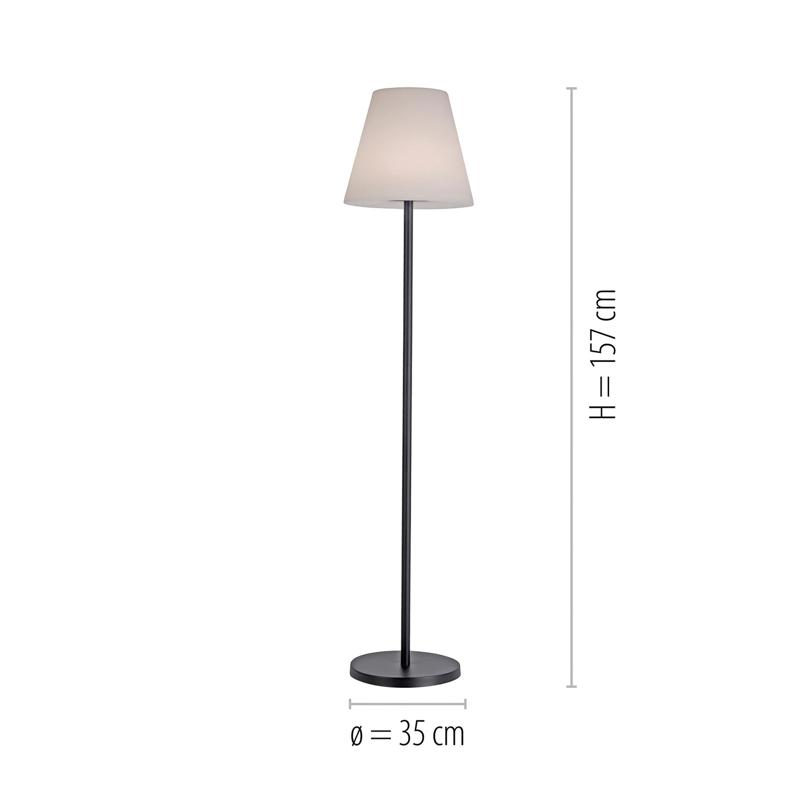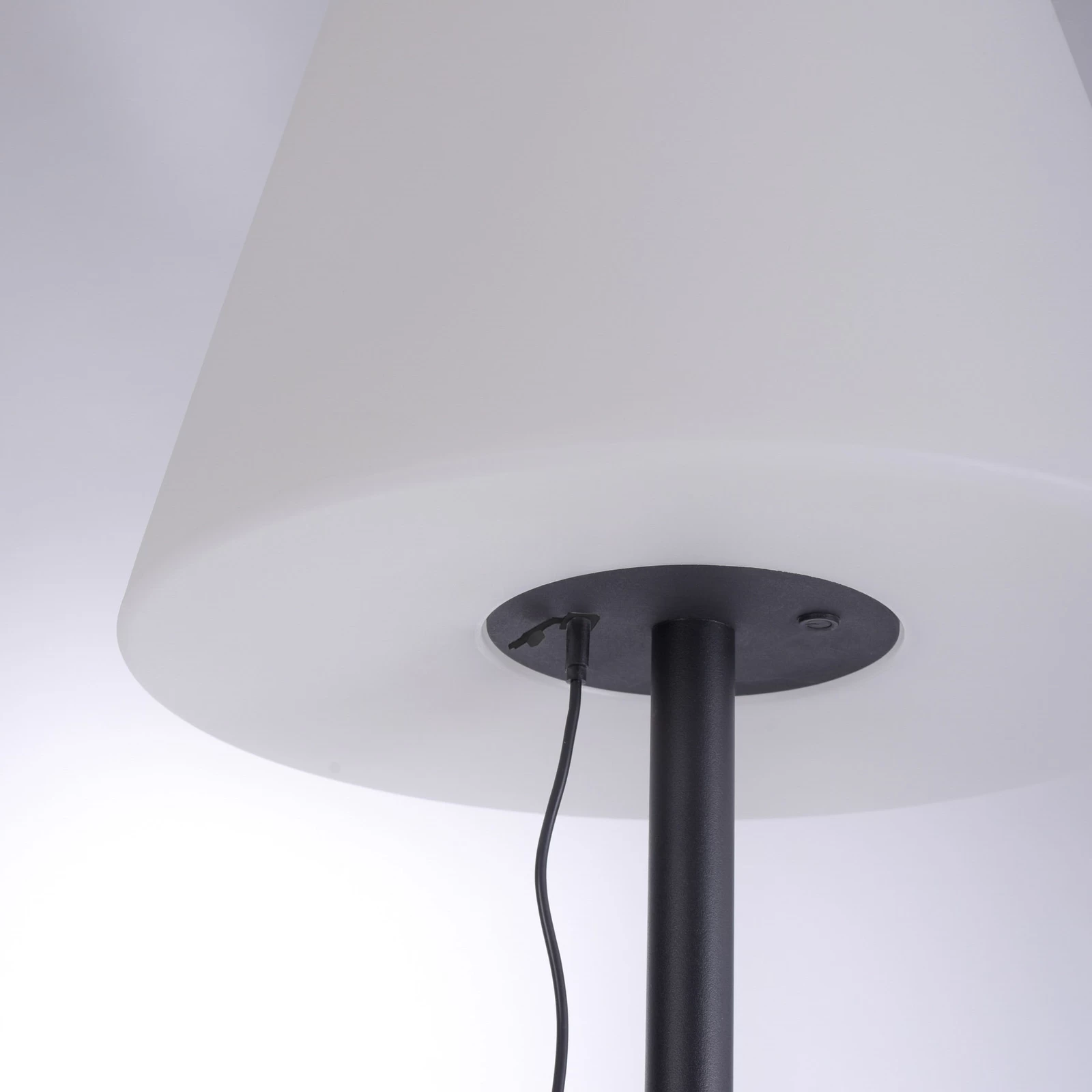 Holly LED-gulvlampen Holly giver moderne accenter og effektiv belysning, som kan opstilles på ethvert udendørs sted takket være batteridrift. Den består af en sort stålramme i klassisk form og en lampeskærm af hvid plast, som giver en jævn og blændfri belysning. Et særligt højdepunkt er, at lyset kan skiftes til monokromt hvidt eller farvet lys via en lille knap på skærmen, så lyseffekten kan ændres efter ønske. Der medfølger et USB-kabel til nem opladning af det integrerede batteri.