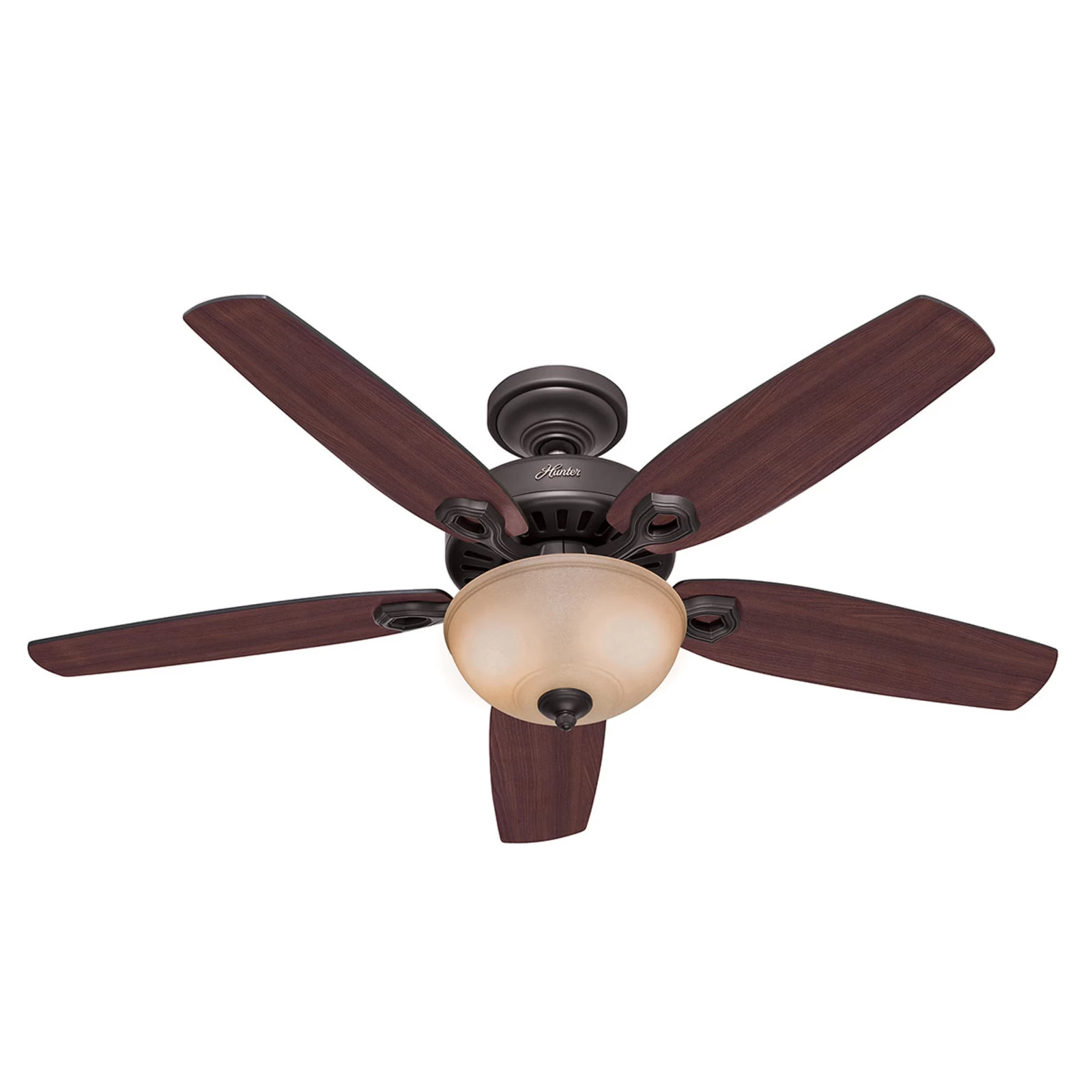 Designet kommer fra den traditionelle linje af Hunter mærket, og imponerer med et koordineret farve- og materialekoncept. Loftventilatoren Builder Deluxe er desuden udstyret med en integreret loftlampe, og giver dermed både belysning og et sundt indeklima. De fem trævinger kan monteres på begge sider, afhængigt af om der ønskes en dekoration i lyst valnød eller kirsebærtræ.