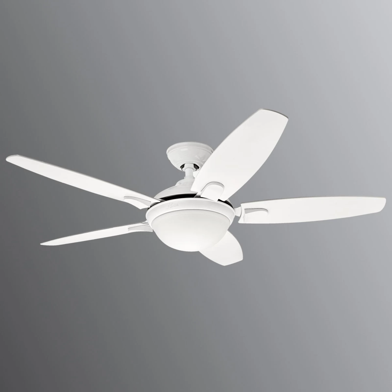 Den moderne loftventilator Contempo imponerer med dens enkle elegance. De fem vendbare vinger i træ, der hovedsageligt er holdt i en elegant hvid, giver her en lille kontrast. De er hvidlakeret på den ene side, og viser et smukt trædekor i lyst egetræ på den anden side. Den er desuden udstyret med en integreret satineret glaslampe, der harmonerer ind i det overordnede billede.