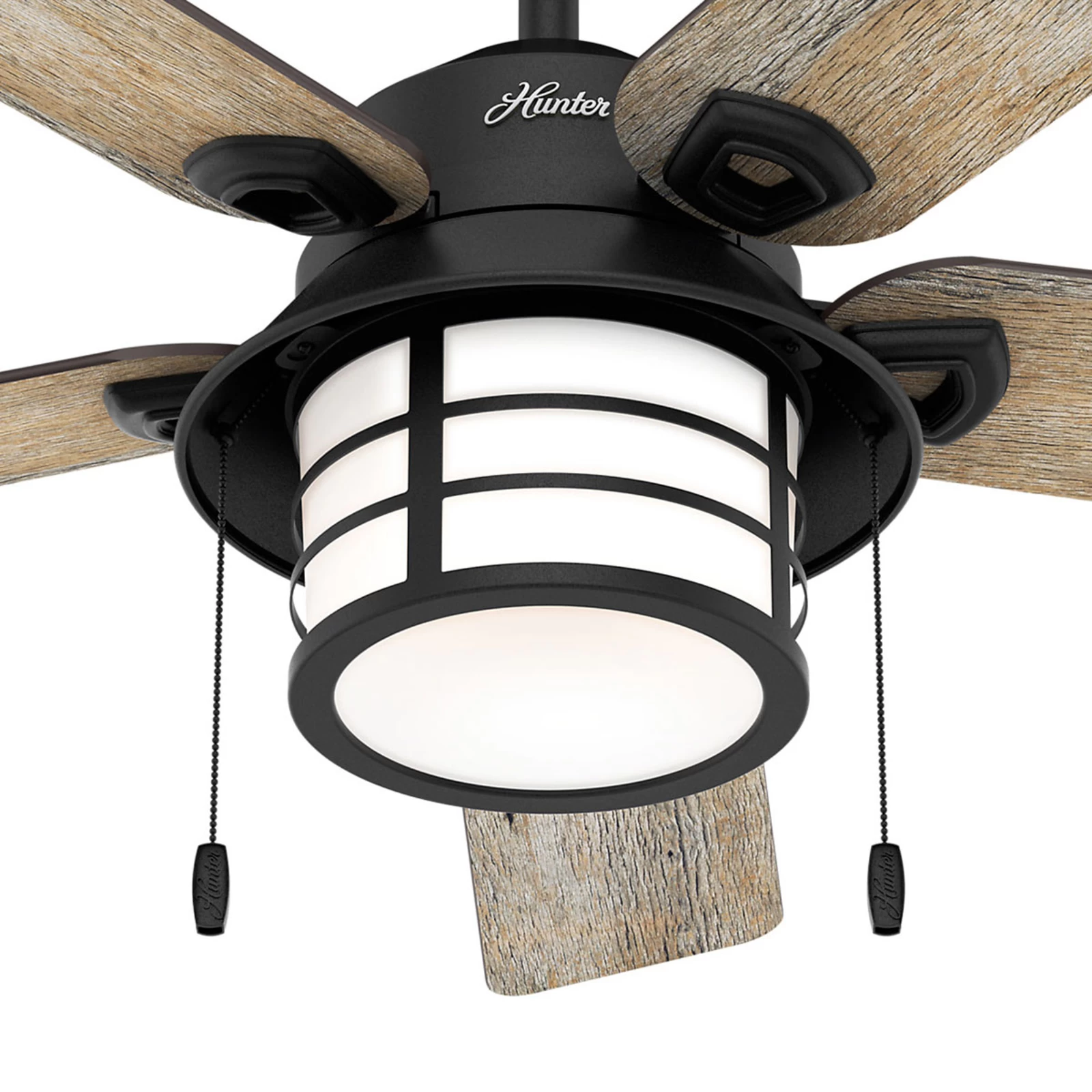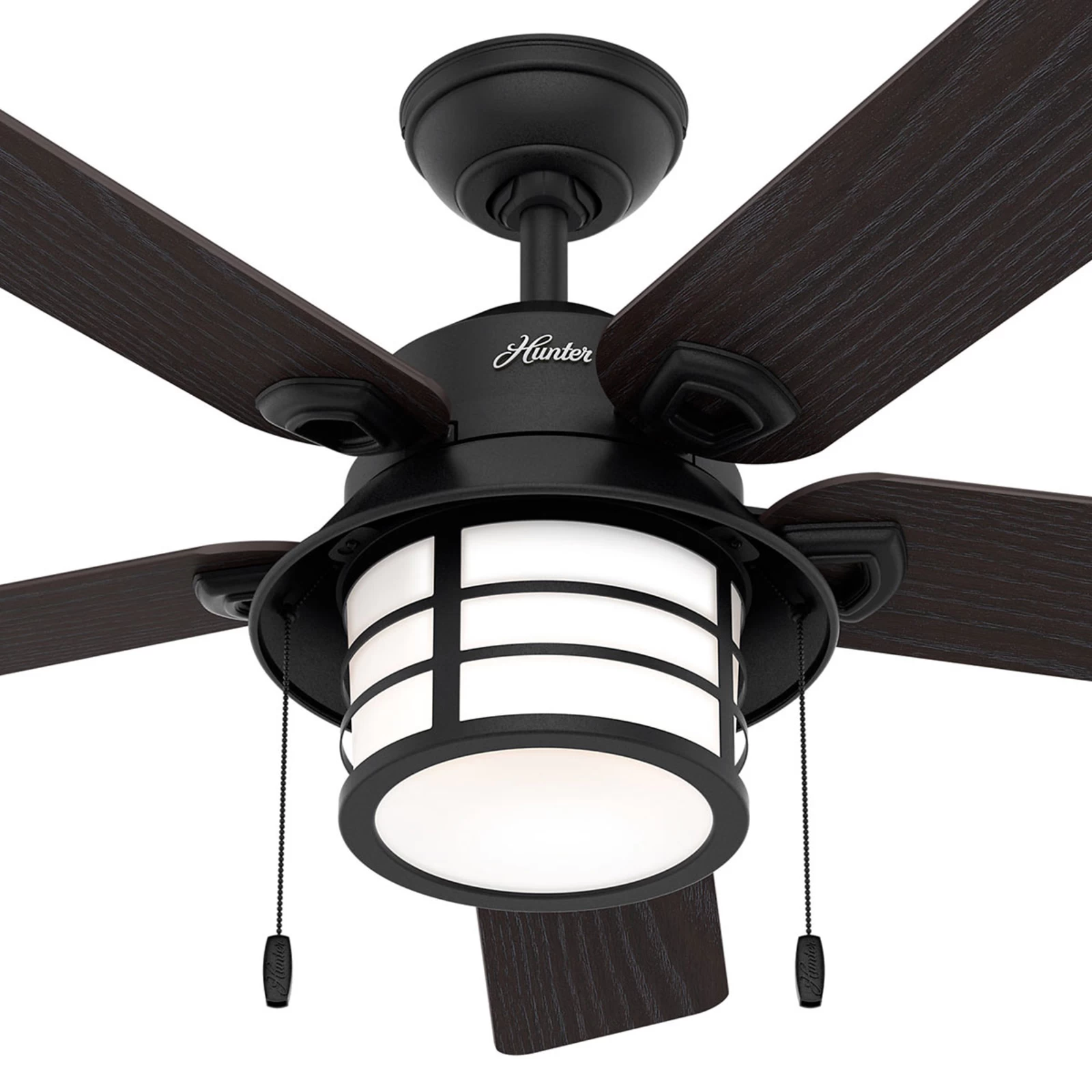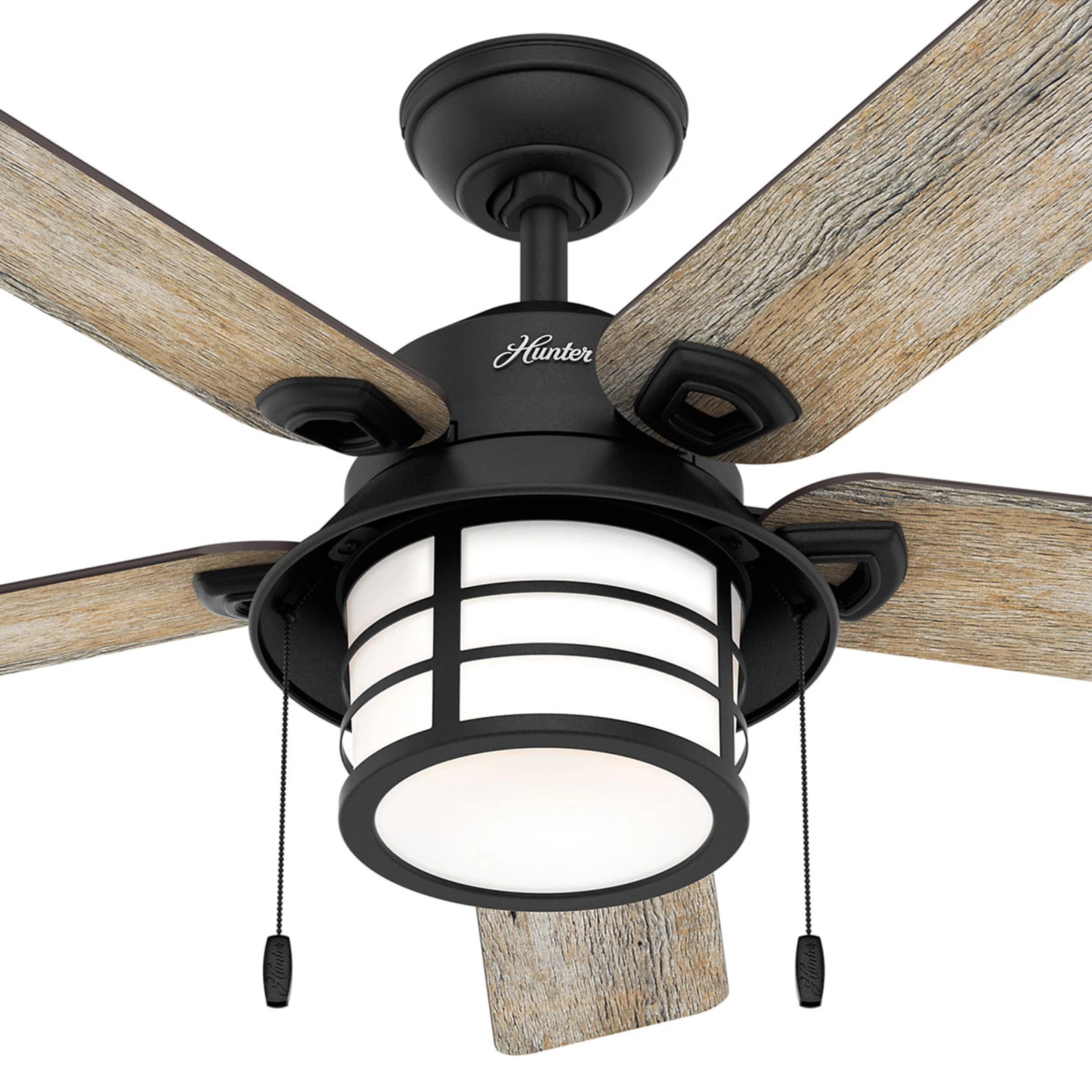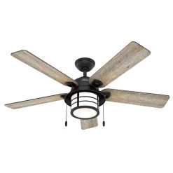 Loftventilatoren Santorini er designet i industrielt look. Den kan både anvendes indendørs samt udendørs, for eksempel på en overdækket veranda. Lampen i midten er forsynet med to E27-fatninger.