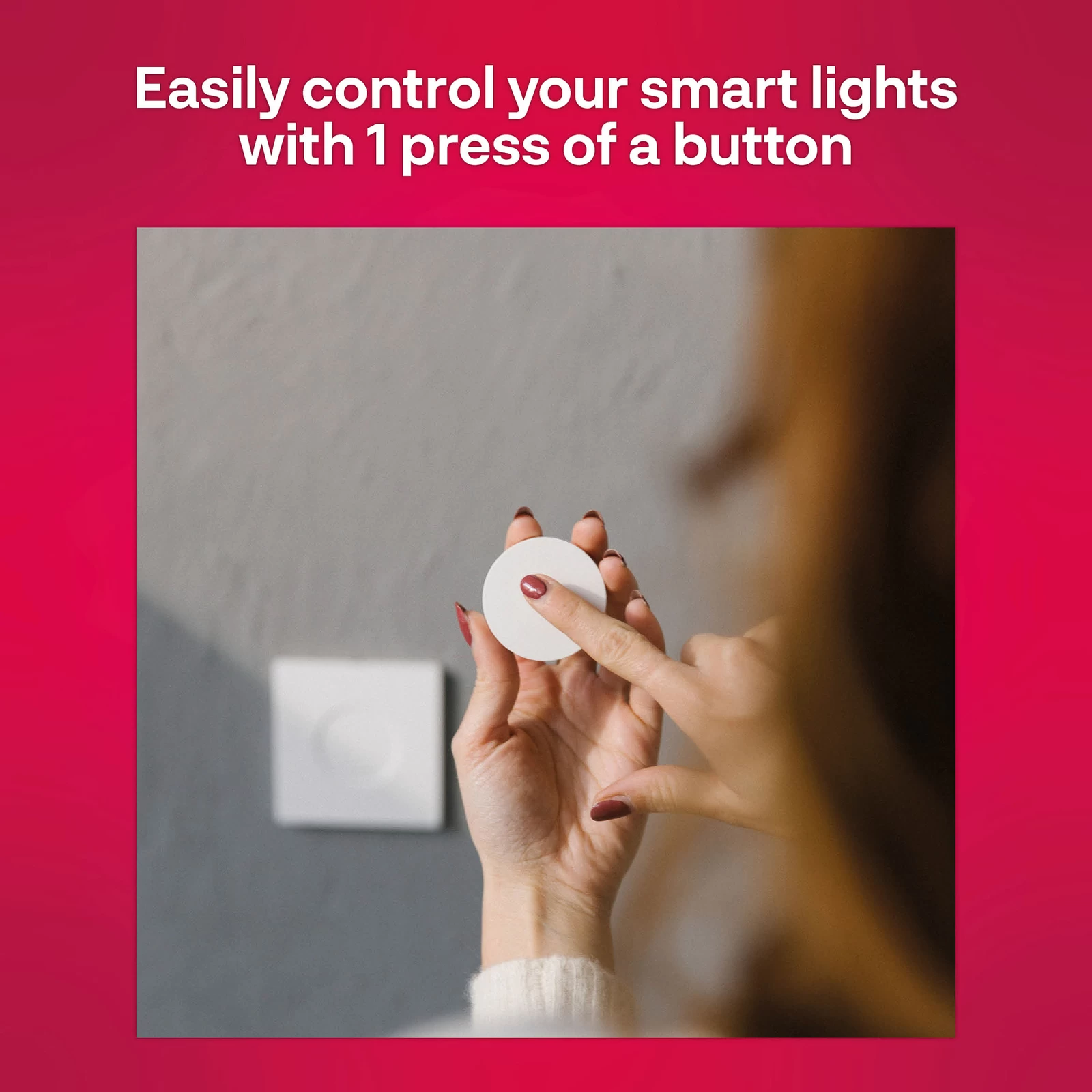 Med Smart Button-fjernbetjeningen kan både ZigBee- og WiFi-armaturer fra Innr og hele armaturgrupper styres bekvemt og trådløst. Visuelt ligner den en normal lyskontakt, men denne 1-knaps fjernbetjening kan mere: Ud over at tænde og slukke kan den også bruges til at dæmpe Innr-armaturer kontinuerligt. I forbindelse med den gratis Innr-app kan der også forudindstilles lysscener, som derefter kan vælges med Smart Button-fjernbetjeningen.