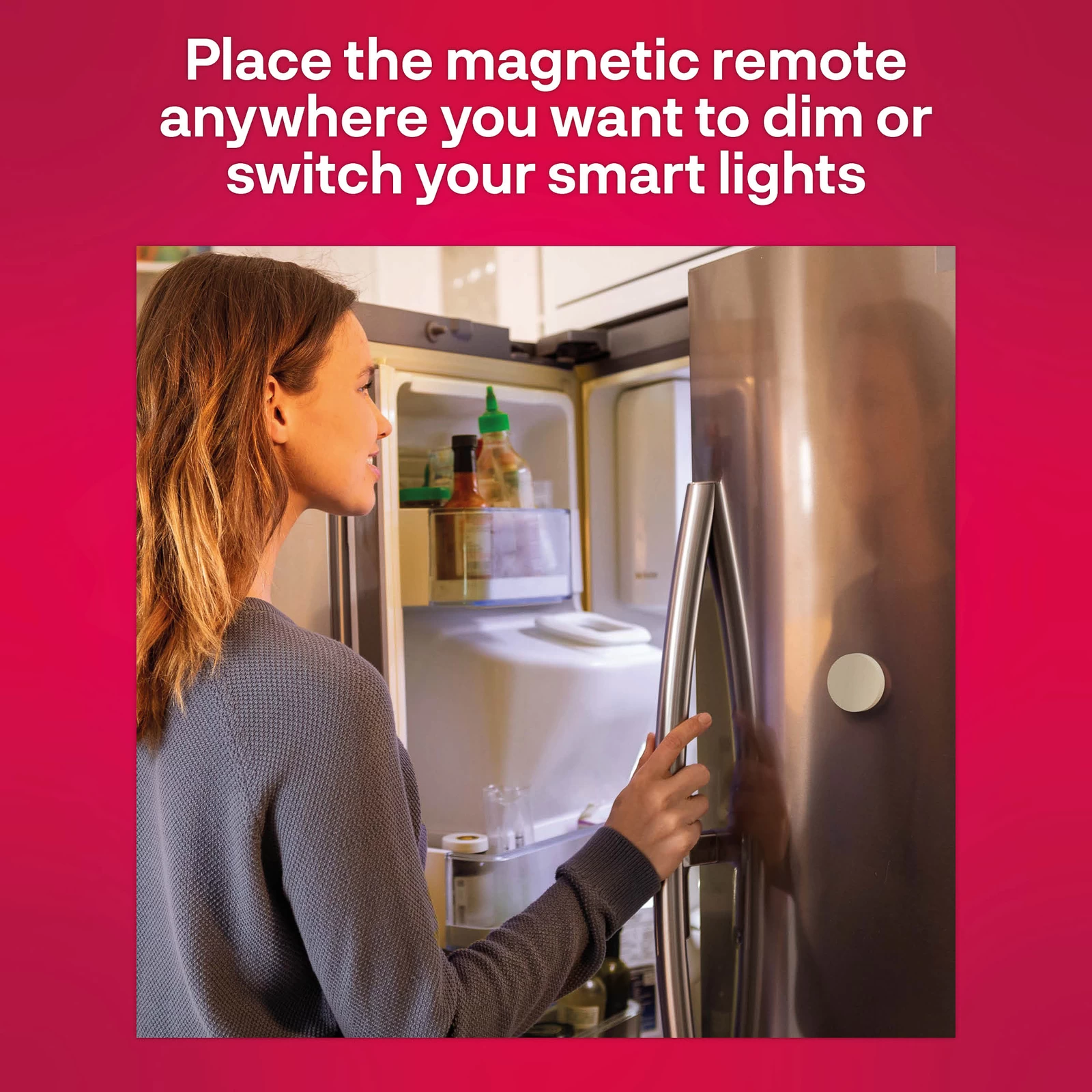 Takket være batteridriften har denne smarte fjernbetjening ikke brug for nogen kabler overhovedet, og dens lille størrelse gør den nem at tage med dig: f.eks. i haven for at styre udendørs lys fra Innr. Der medfølger et vægbeslag til at fastgøre den på væggen, og da den er magnetisk, kan den også fastgøres til metaloverflader, f.eks. køleskabet.