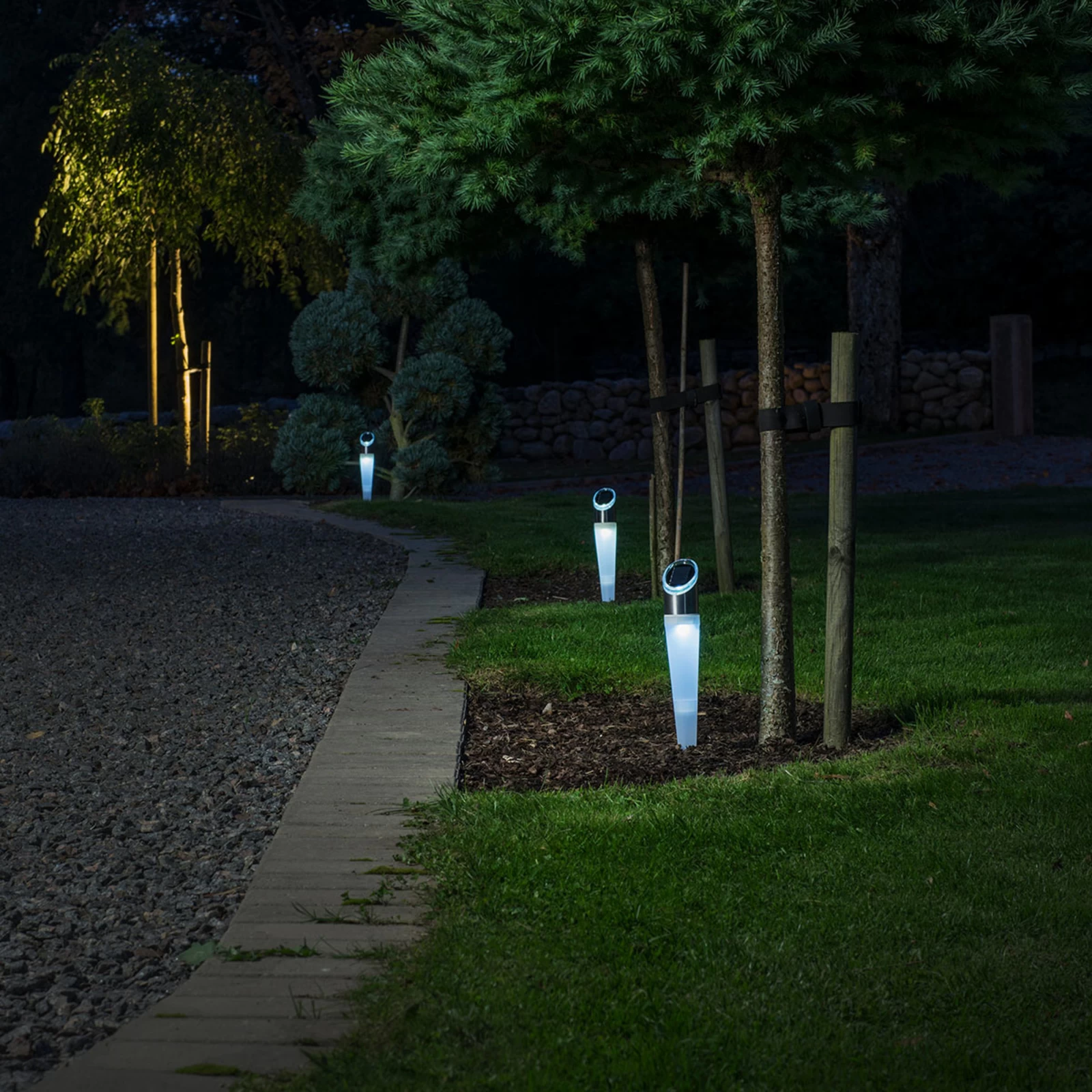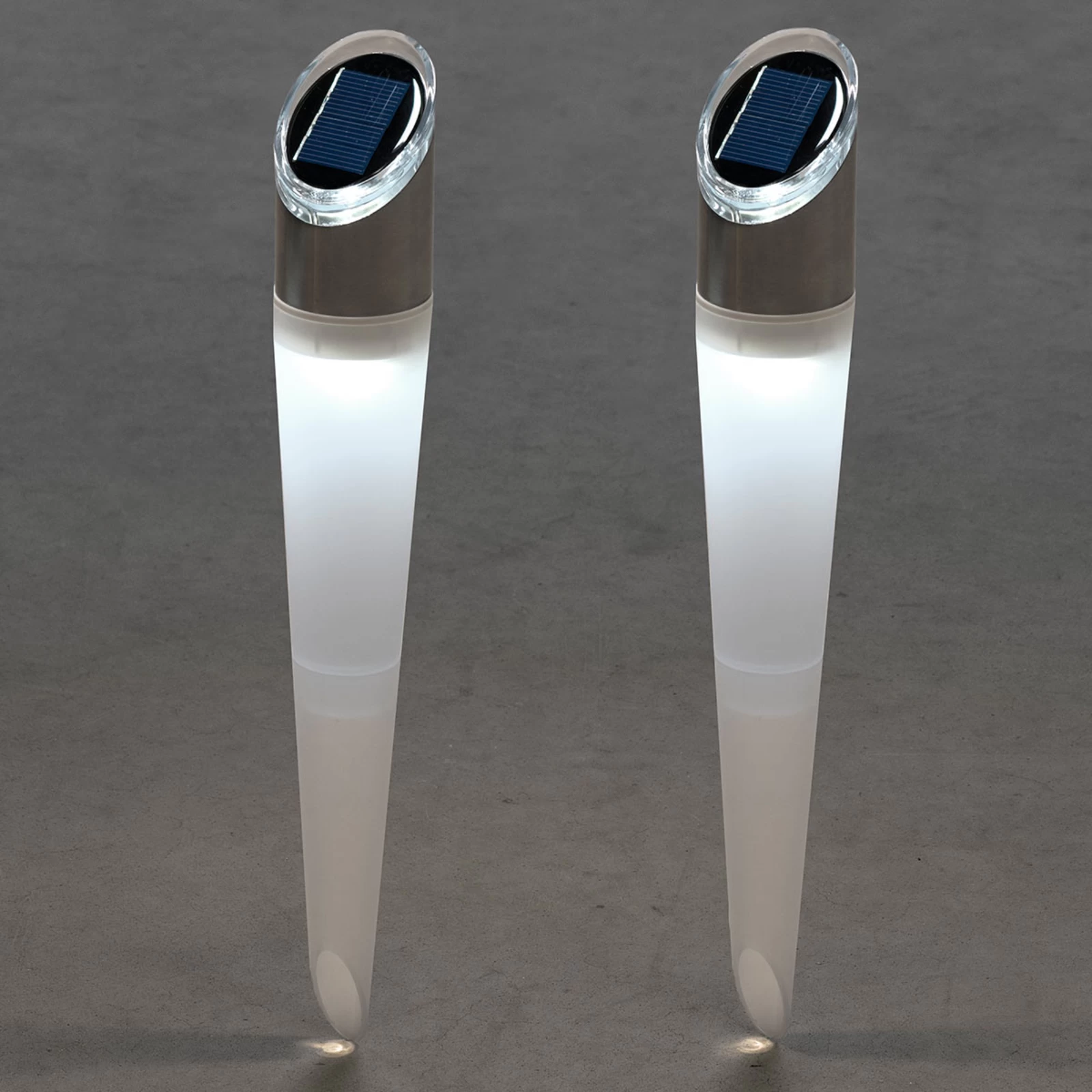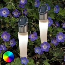 Med dette sæt med 2 LED-spidslys bliver haven en absolut oase af velvære, fordi de to lys, der for det meste er lavet af frostet plastik og er udstyret med et kraftigt solpanel på toppen, kan skiftes til to forskellige belysningstilstande, hvad skaber forskellige atmosfærer. Enten konstant dagslys (6.500 K) eller en farverig RGB farveskift kan indstilles, så hele armaturhuset skinner i forskelligt lys og således forsigtigt og effektivt iscenesætter omgivelserne. Den integrerede tusmørkesensor sikrer også, at den automatisk tændes / slukkes.