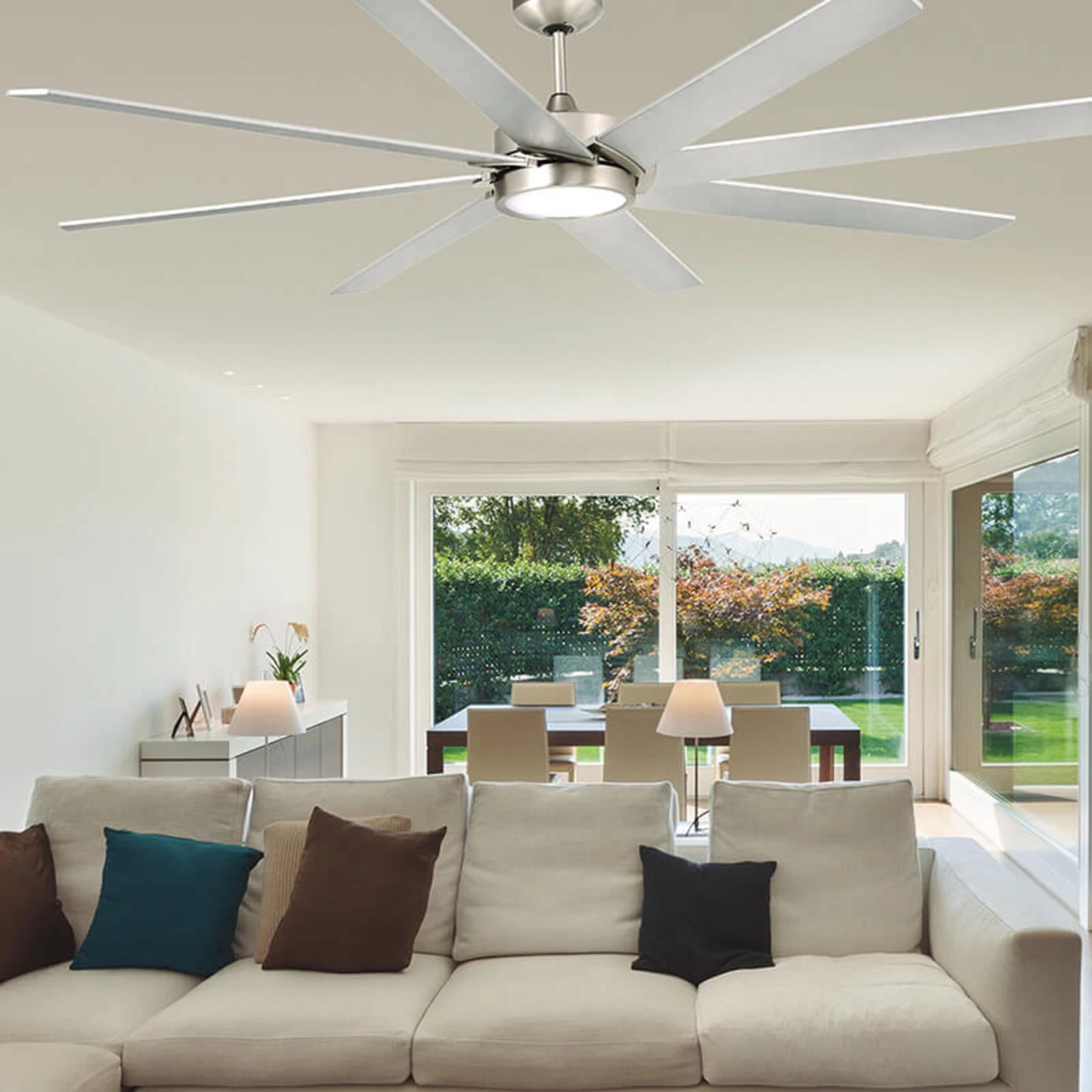 Loftventilatoren Century er ikke kun en passende luftfrisker for større opholdsstuer, men giver også via den integrerede LED lampe omfattende rumbelysning. Designmæssigt passer den på grund af dens diskrete former og farver, til mange bolig stilarter