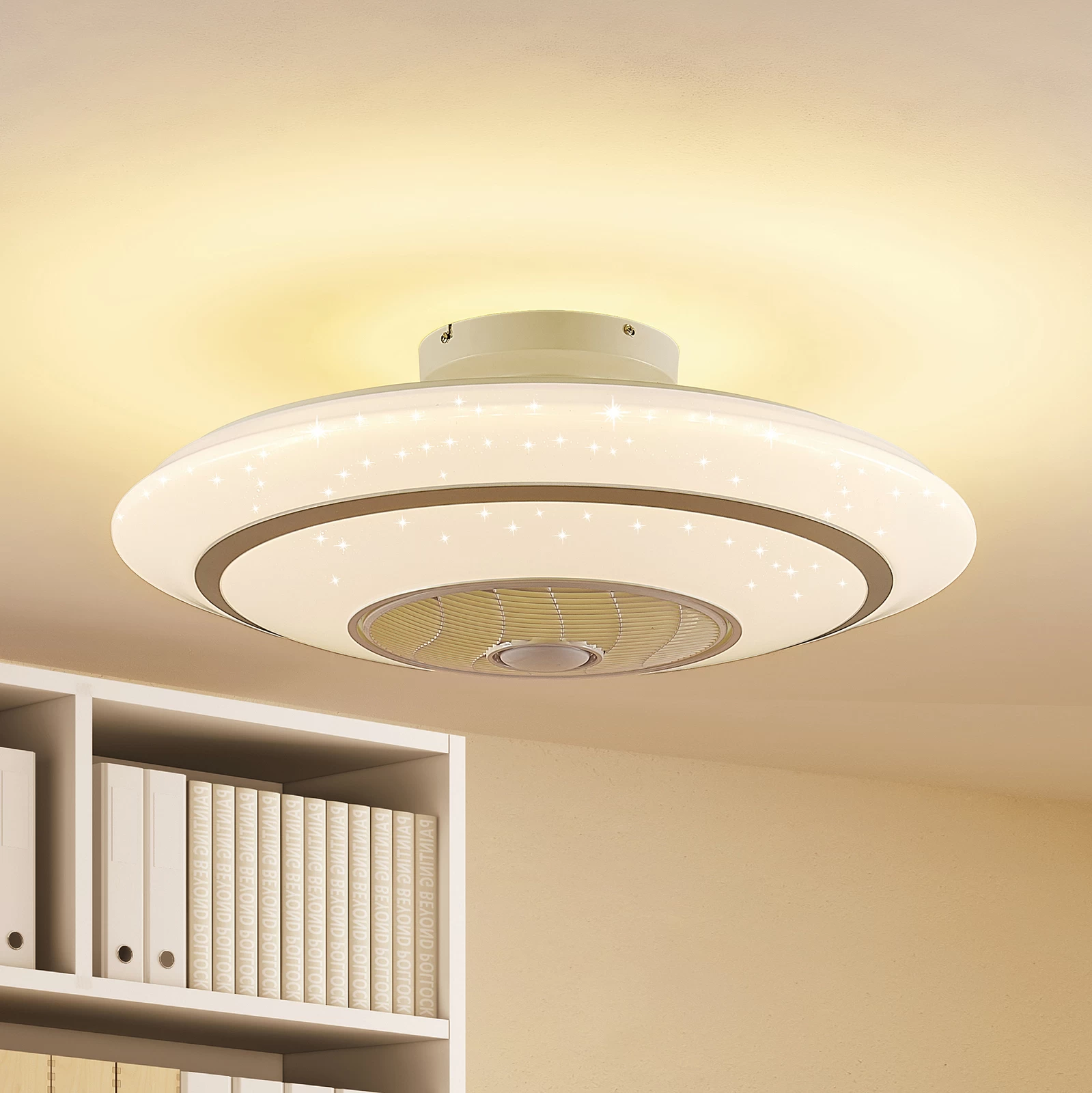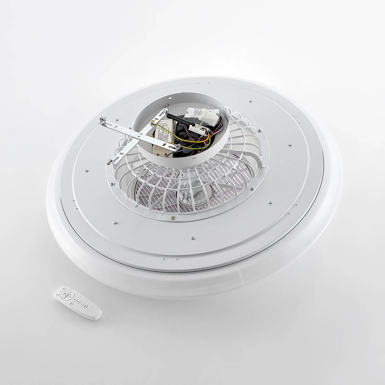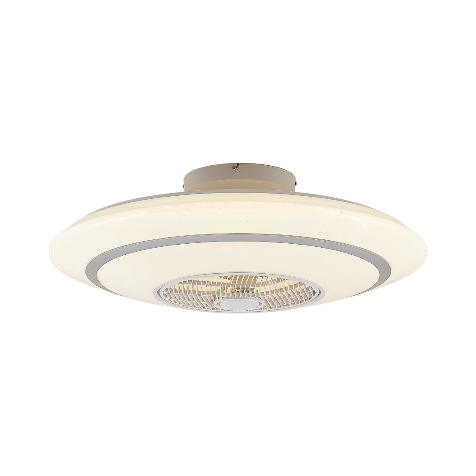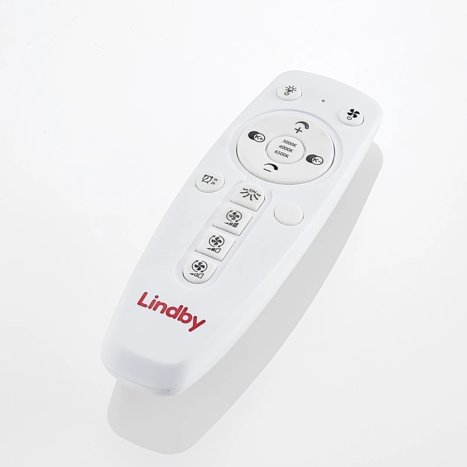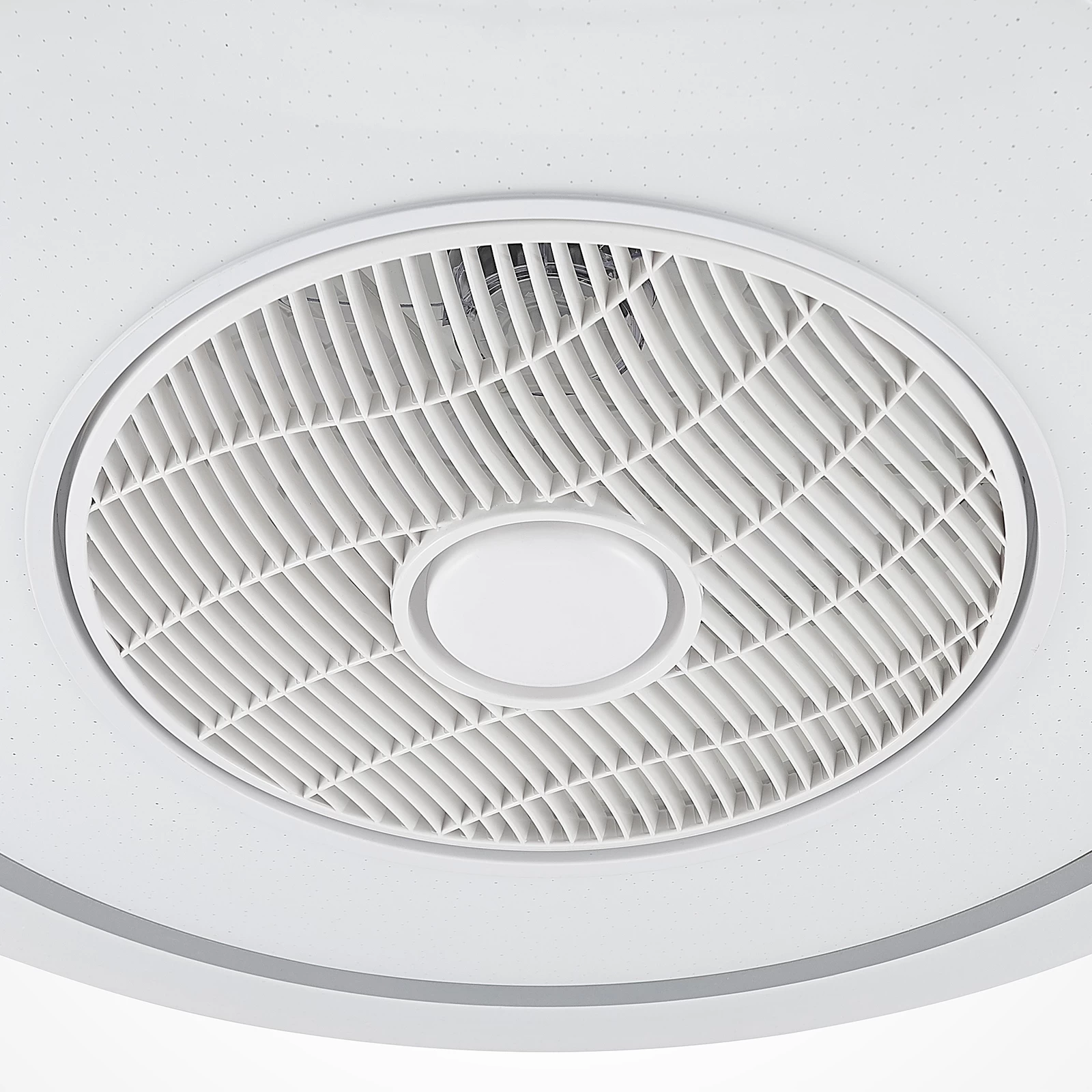 ventilator har en fjernbetjening ved hjælp af hvilken det permanent installerede LED-modul kan dæmpes og indstilles i tre forskellige farvetemperaturer (3.000 K, 4.500 K og 6.500 K). Den er velegnet til en rumstørrelse på 15 m² og har også en gitterskive, der kan drejes om nødvendigt. Hvis du aktiverer ionfunktionen med fjernbetjening, roterer disken med dens skrå riller langsomt i en cirkel. Dette betyder, at luften kan fordeles bedre i rummet med hver rotation.