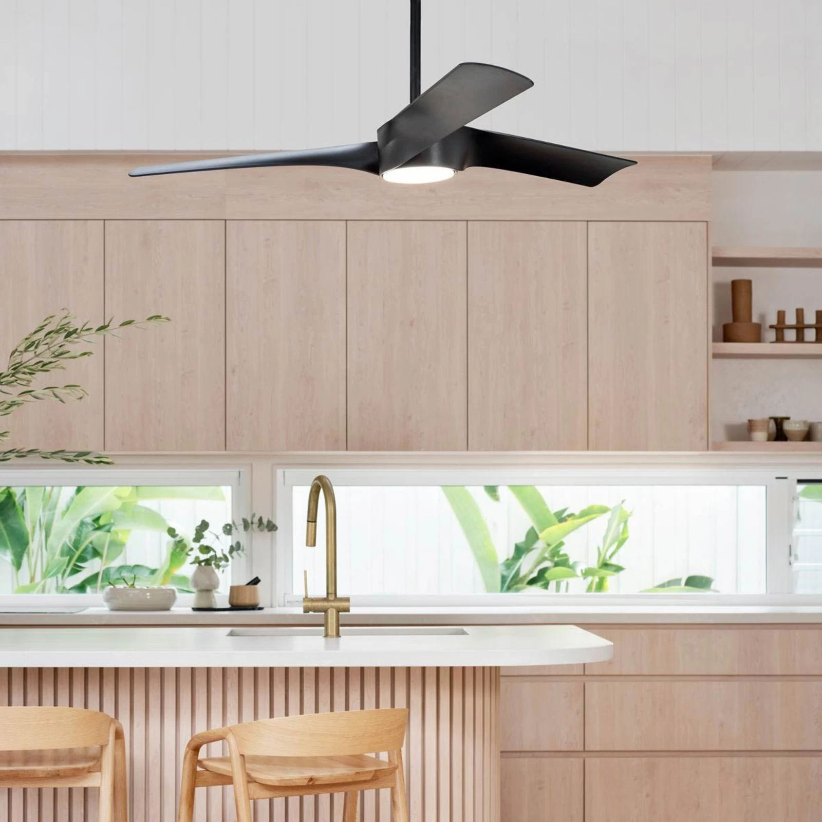 Trebladet LED-loftventilator Line i moderne look – med dæmpbar belysning