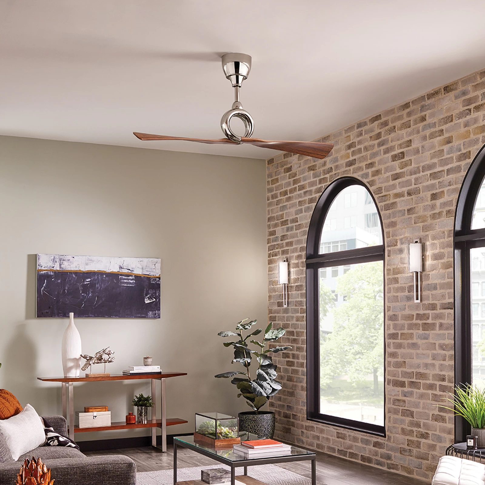 Link loftventilatoren med dobbeltvinge er med sine to ABS plastvinger, der udgår fra en stålring, tilsyneladende fremstillet i ét stykke. Den visuelle kontrast mellem poleret nikkel og mørk valnøddetræstone er også særligt dekorativ. Der medfølger en fjernbetjening.