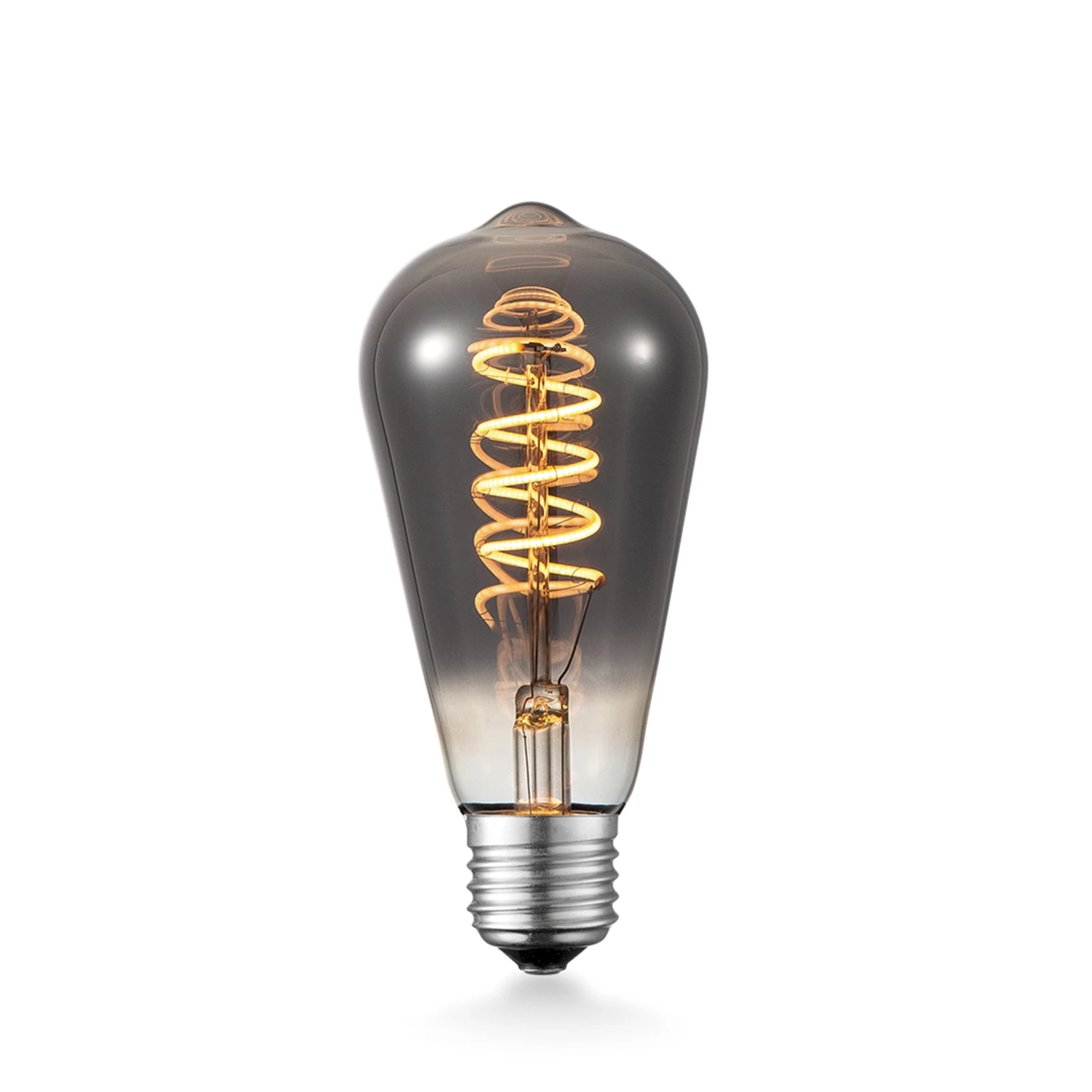 E27 ST64 LED-lampe 4W med varmt hvidt lys i Rustika-form Designet af denne E27 LED Rustika-lampe har et nostalgisk præg. Det særlige ved den er også glasfarven i titanium, som ser markant og eksklusiv ud. Glødetrådsspiralen inde i lampen skiller sig ud med sit særligt varmt hvide lys, som skaber en smuk kontrast. Især i åbne og skærmløse armaturer kommer denne interessante lampe til sin ret, og dens farvegengivelse er fremragende (CRI >; 90) Tekniske data – dæmpbar via fase- og fasedæmper – energieffektivitetsklasse B – sammenligningsværdi: 3 W – levetid: 25.000 h – koblingscyklusser: 50.000 – effektfaktor >; 0,9 – CRI >; 90 Særlige kendetegn – glødetrådsoptik – dekorativ karakter
