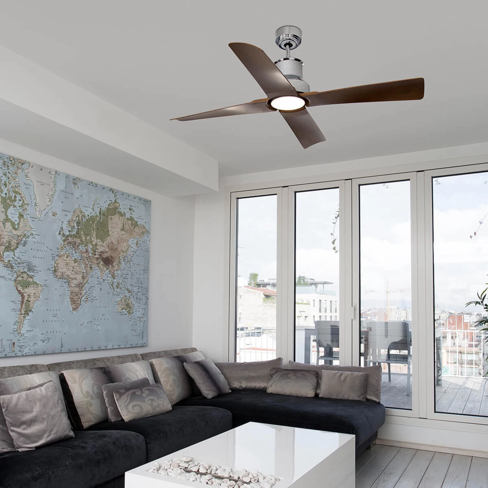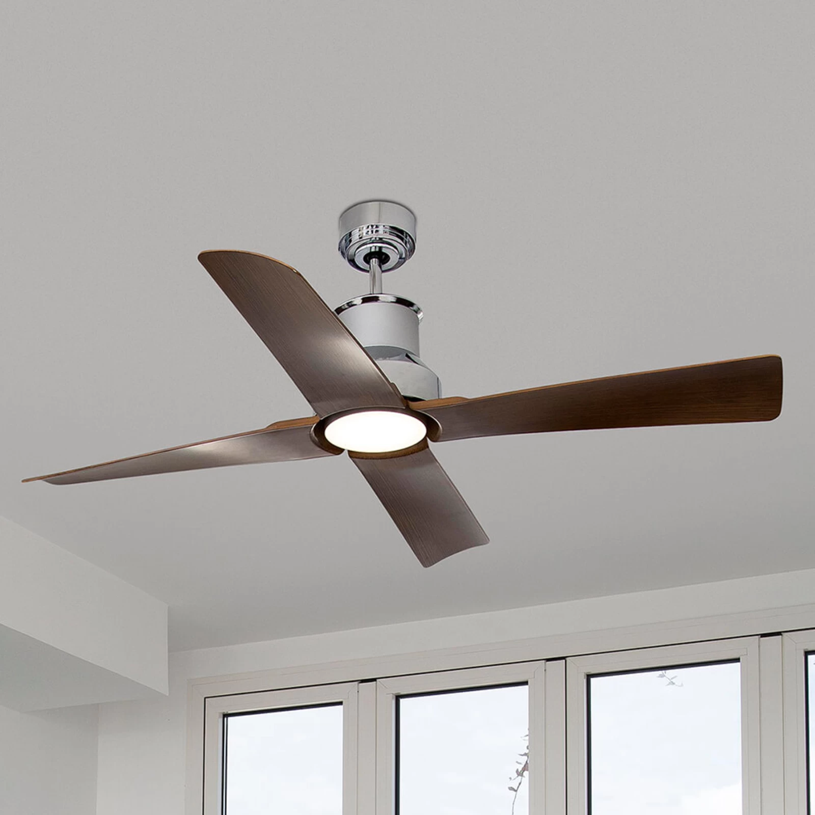 Det forkromede kabinet på loftventilatoren Winche, står i slående kontrast til plastvingerne i mørk trædesign. Loftventilatoren Winche der egner sig til rum med en størrelse på 25 kvm, kan suppleres om nødvendigt med et lyssæt (ikke inkluderet, tilgængelig under tilbehør).