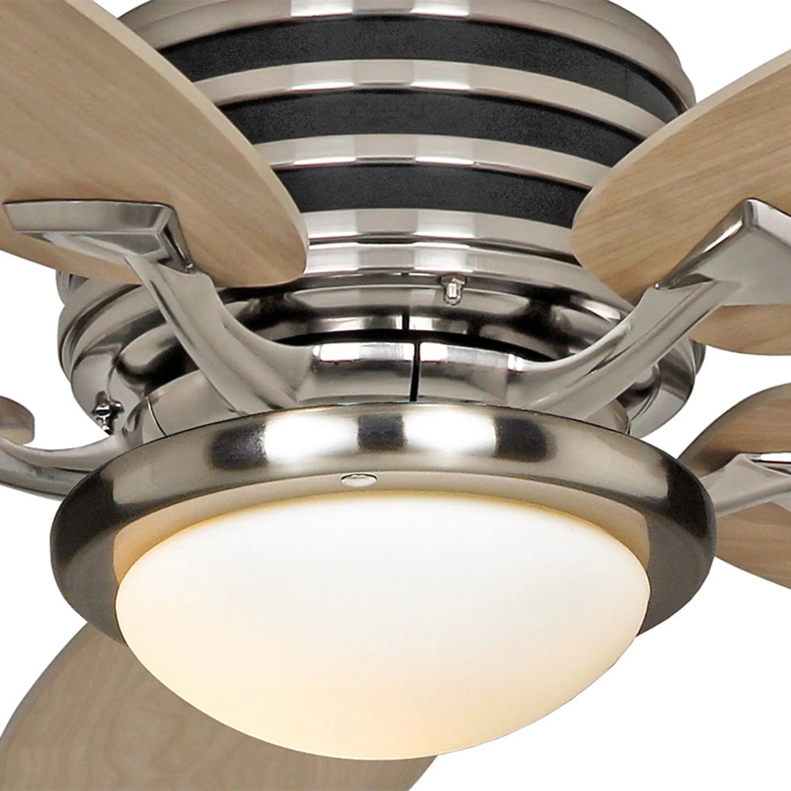 La Gamma overflademonterede armatur består af et metalbeslag med krom look og et mindre objektivformet dæksel lavet af opalglas. Det tager to E27-lamper og er velegnet til udrustning og eftermontering af loftsventilatorer fra Eco Gamma-serien. Det overflademonterede lys tændes og dæmpes via fjernbetjening .