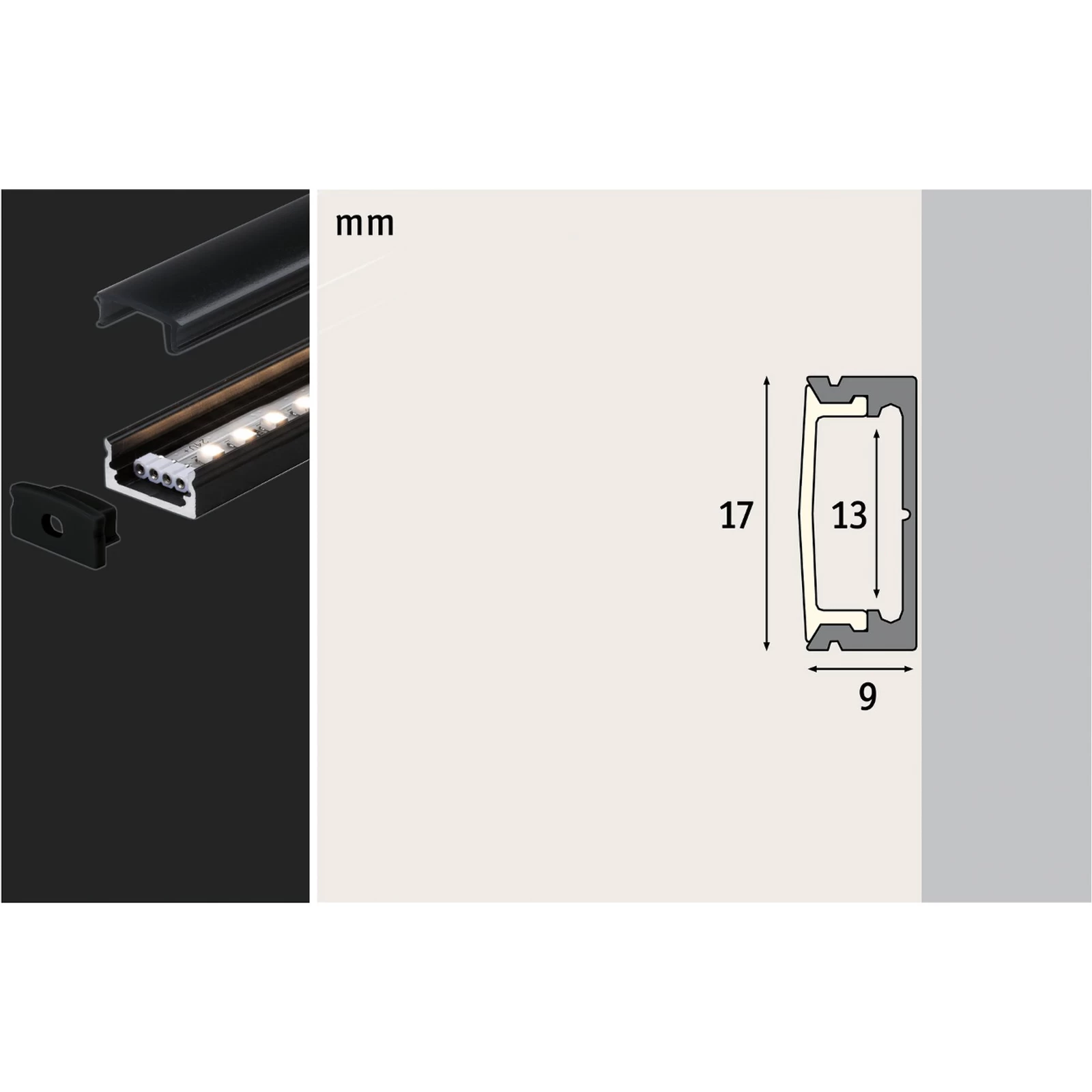 Denne smalle profil til overflademontering i mat sort kan bruges til at skabe dekorative belysningsaccenter på møbler eller vægge. Profilen er fremstillet af aluminium og er designet til brug med en MaxLED 1000 LED-strimmel (medfølger ikke), og den sorte, satinfarvede skærm skaber en særlig wow-effekt, når LED-strimlen tændes.
