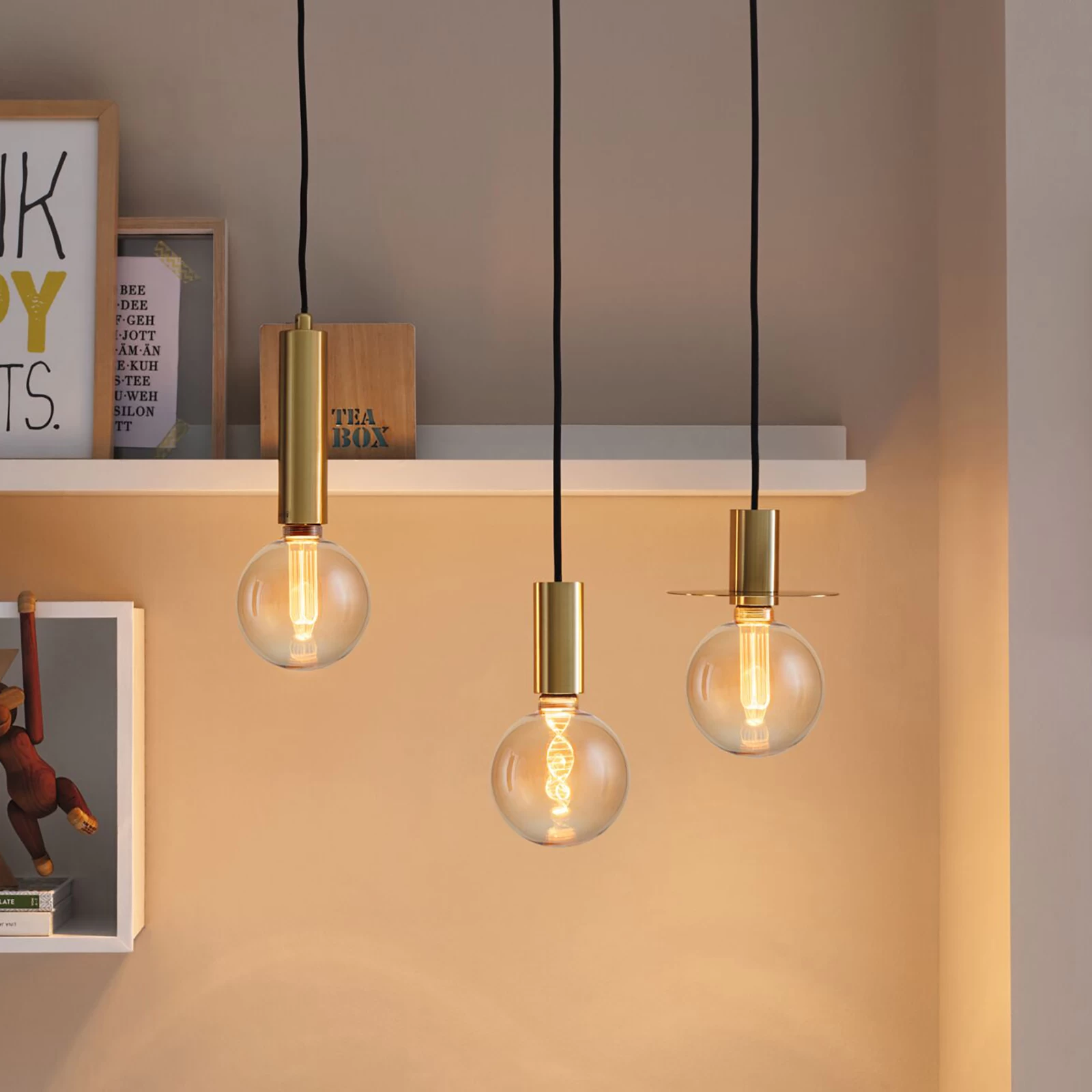 Åbne og skærmløse armaturer er anvendelsesområdet for denne lampe med sit dekorative udseende. LED’erne er anbragt i en bue i det guldfarvede glas, og den fine lasergravering sikrer, at det ekstra varme guldlys udsender et absolut blændfrit lys. Den nederste, lysende ring i lampen giver et rettet lys i retning af bordpladen.