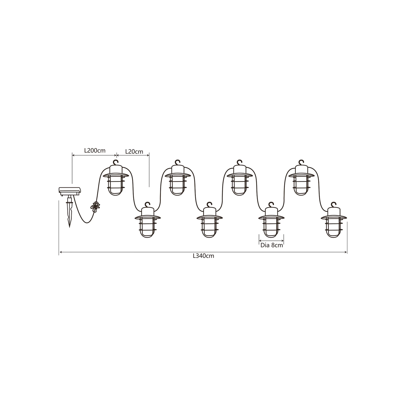 | Andre dimensioner | Ø lygter 8 cm; afstand mellem solpanel og 1. lygte 200 cm; afstand mellem lygterne 20 cm |