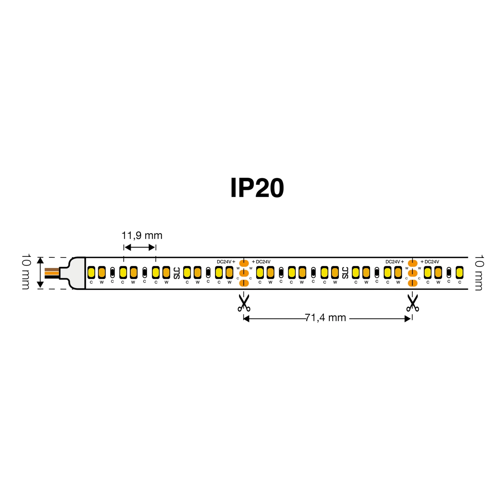 Denne LED strip har en justerbar farvetemperatur fra 2.700 til 6.500 K og er også dæmpbar, så lyset kan tilpasses perfekt til stedet og den pågældende situation. Med 168 LED’er pr. meter opnås en homogen lyslinje. Strimlen kan skæres til den ønskede længde før montering. For at opnå tilstrækkelig køling anbefales det at installere den i en profil.