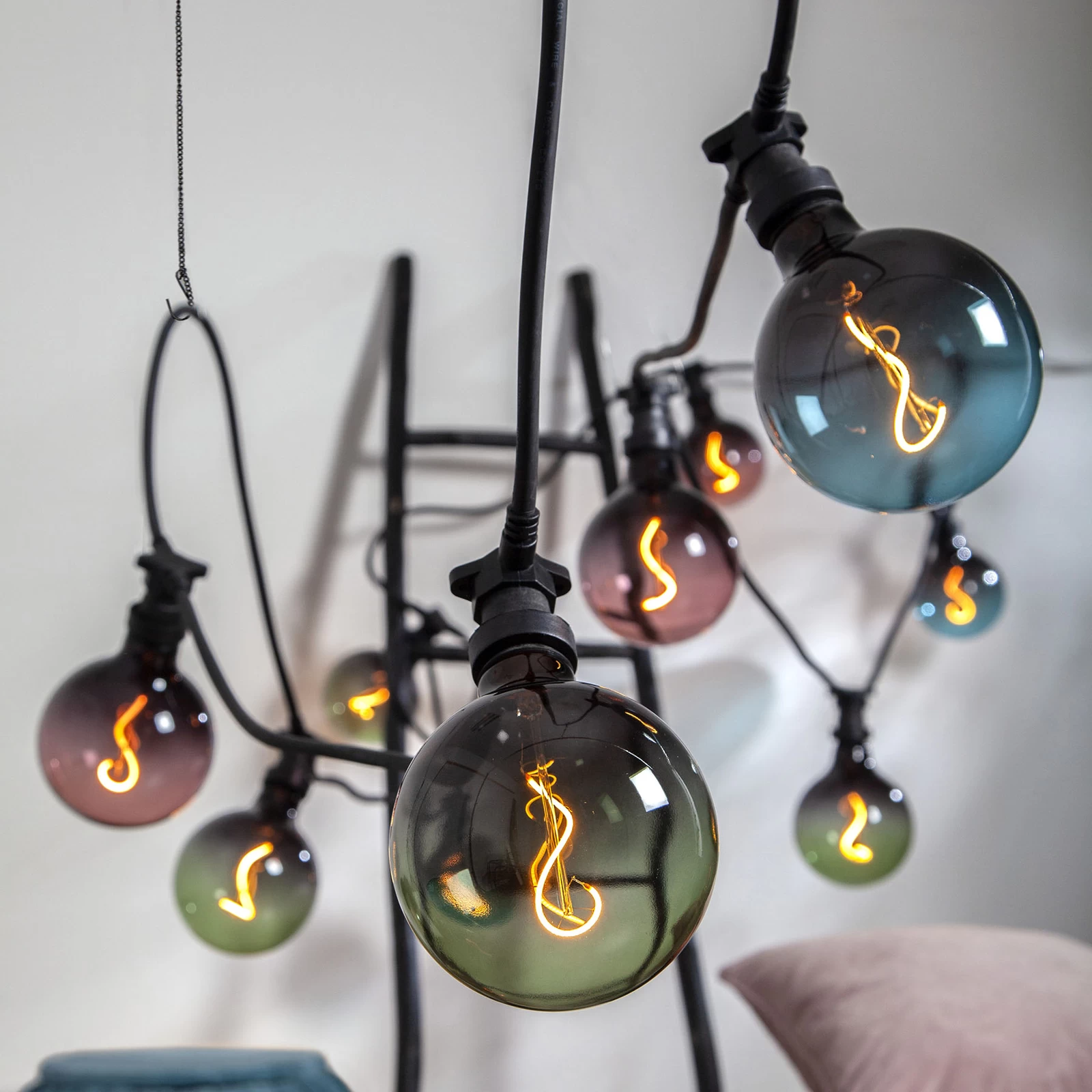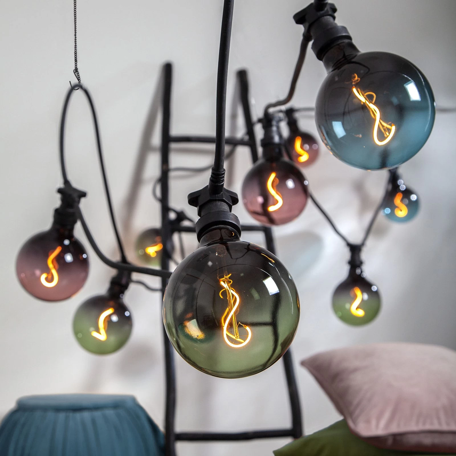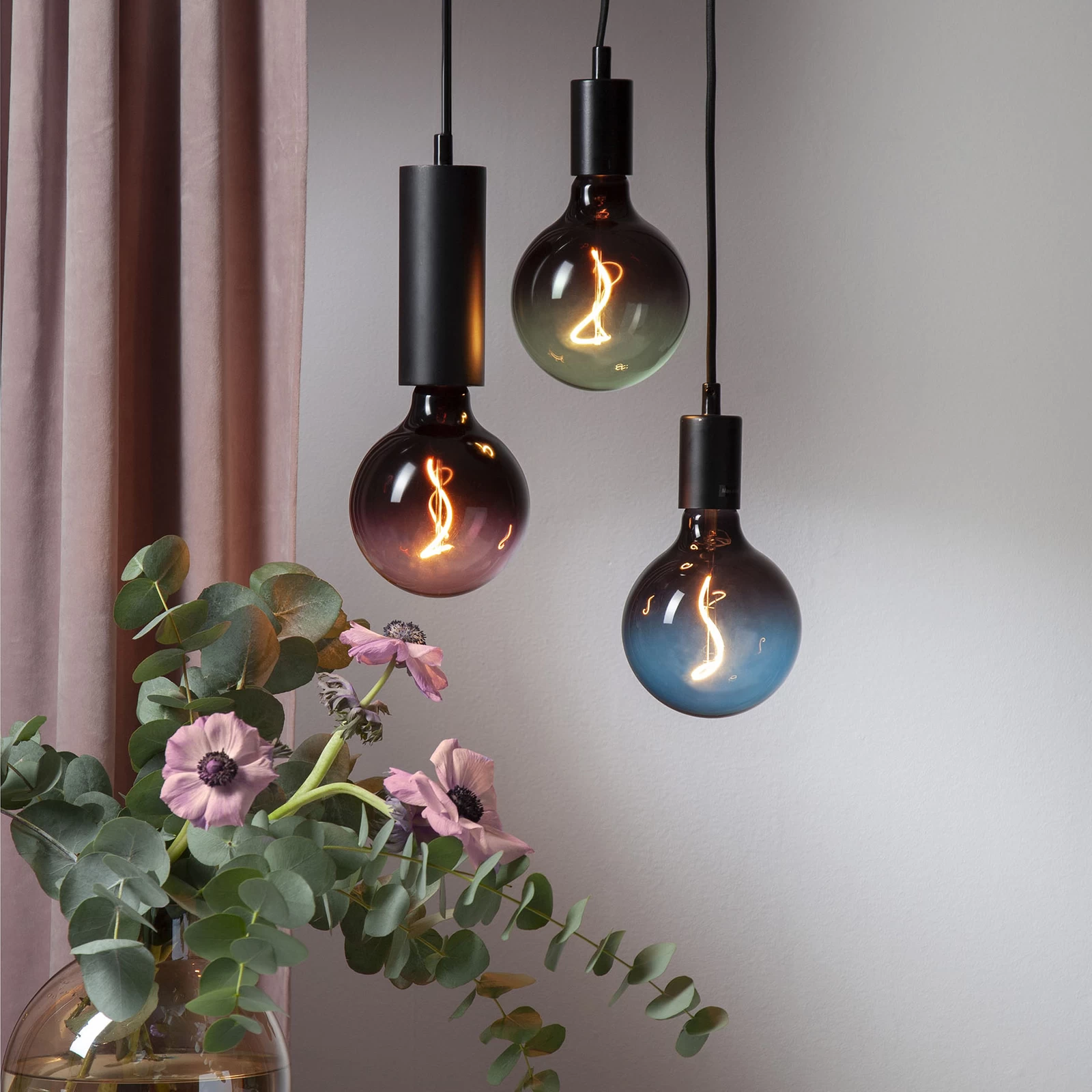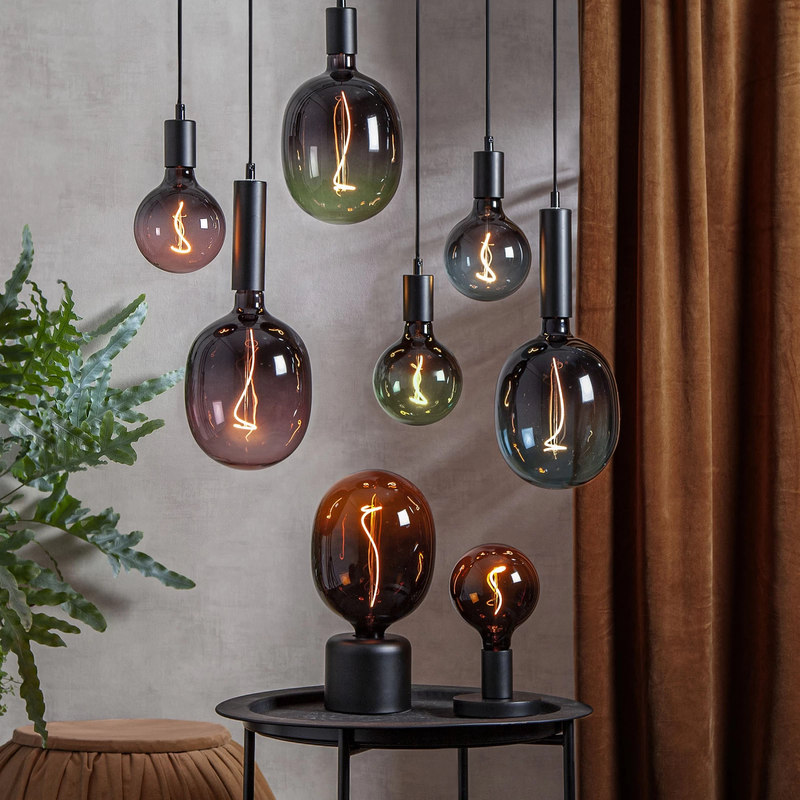 En betagende lysoplevelse! Denne kuglelampe har et klart glas, der er skinnende på ydersiden og farvet i en sort-rosa gradient. Indeni lyser en buet LED-glødetråd. Takket være det iøjnefaldende udseende kræver lampen ikke noget kompliceret armatur – en simpel ophængning med fatning er alt, hvad der er nødvendigt.