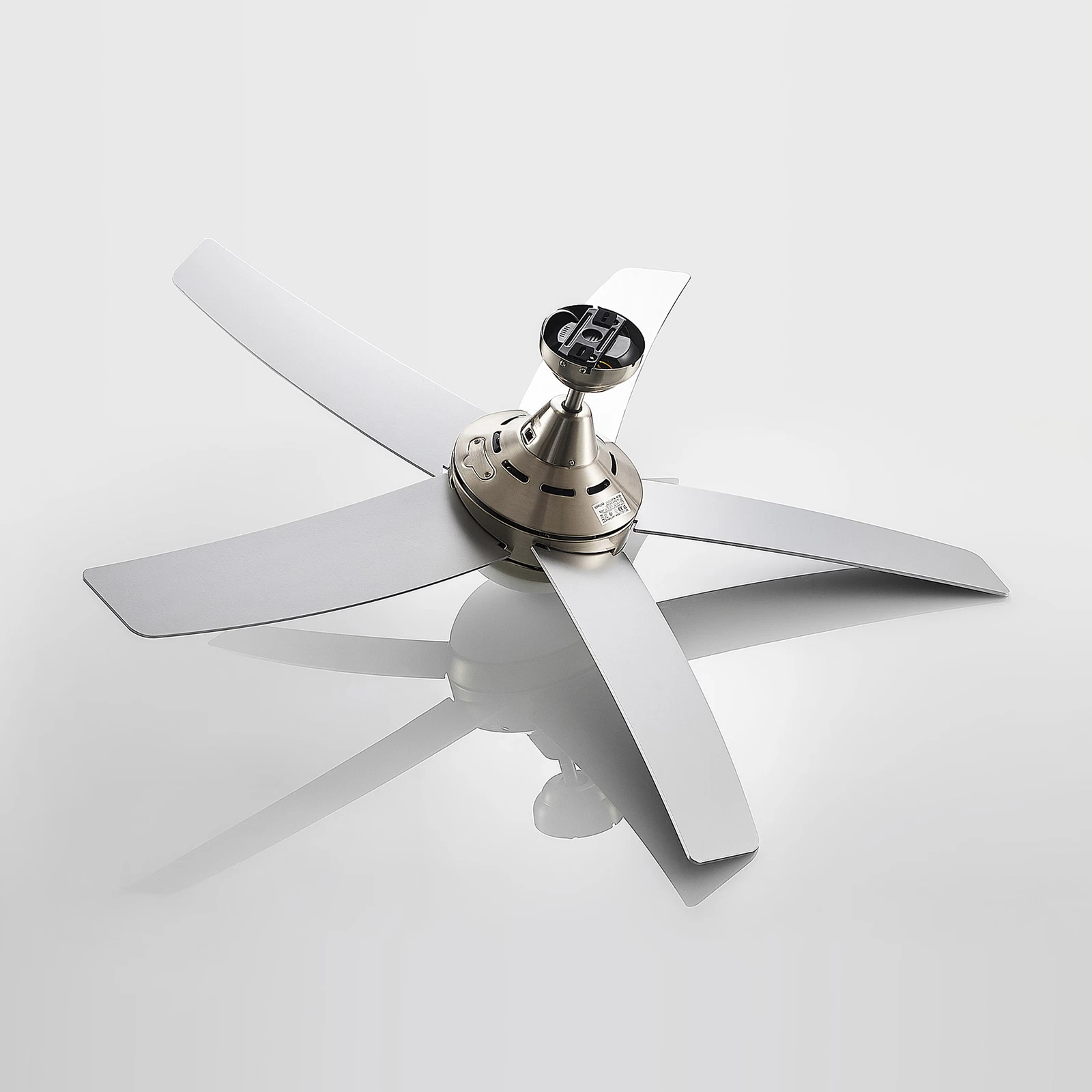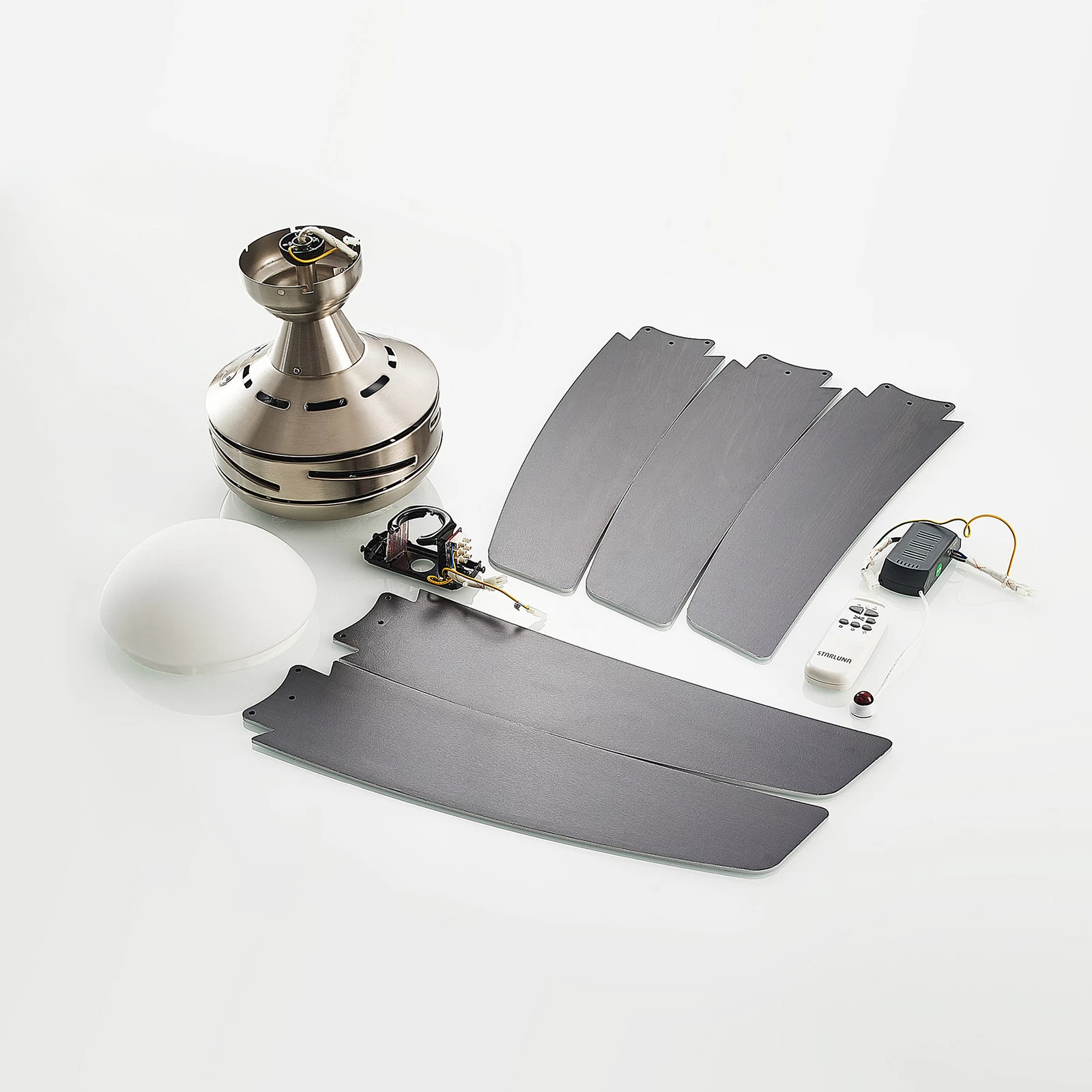 Loftventilatoren er fremstillet af stål, træ og glas. De fem lameller omgiver en skærm, bag hvilken der kan indsættes tilsvarende lamper. Designet er holdt i en harmonisk farvekontrast af grå og sort og afrunder det moderne design på en behagelig måde.