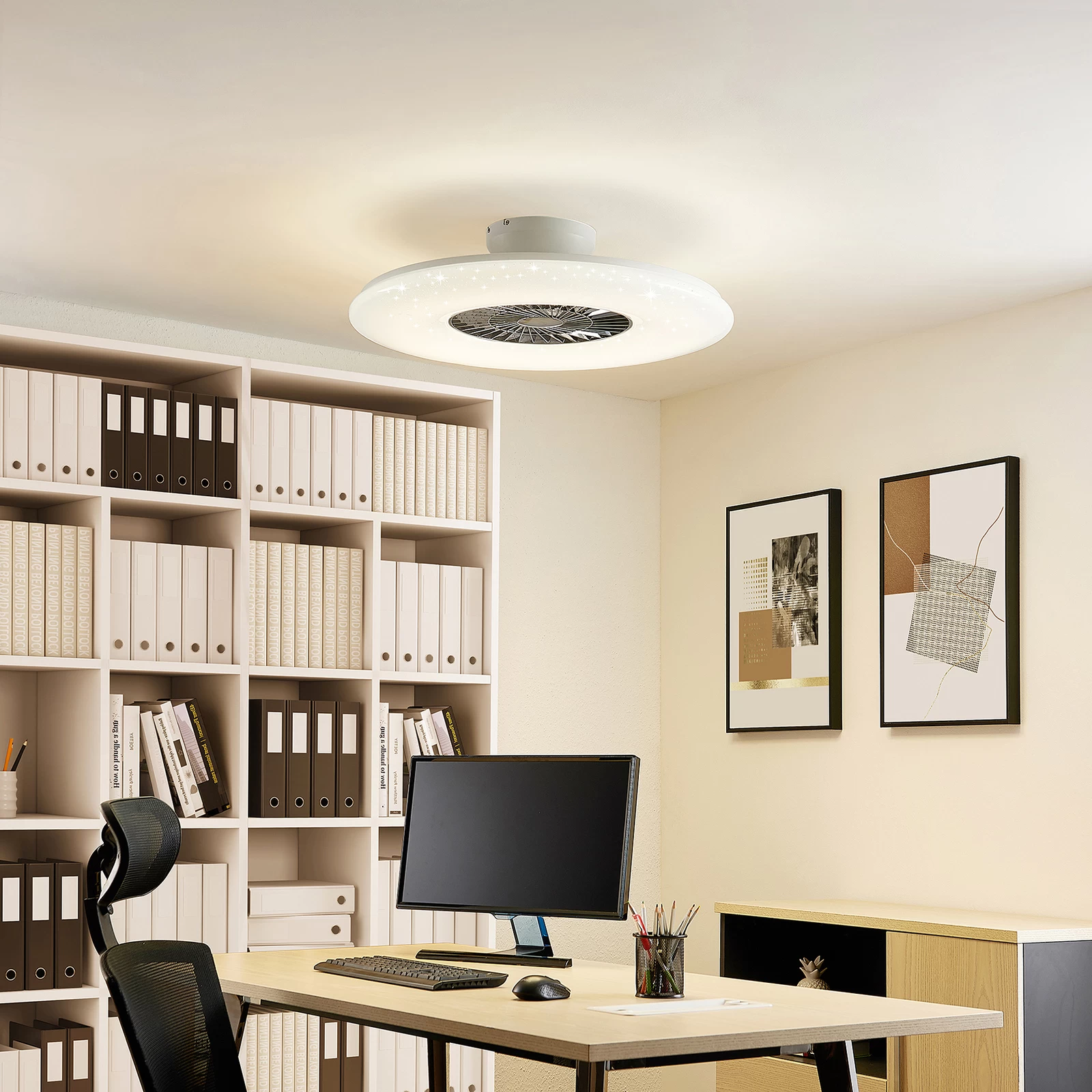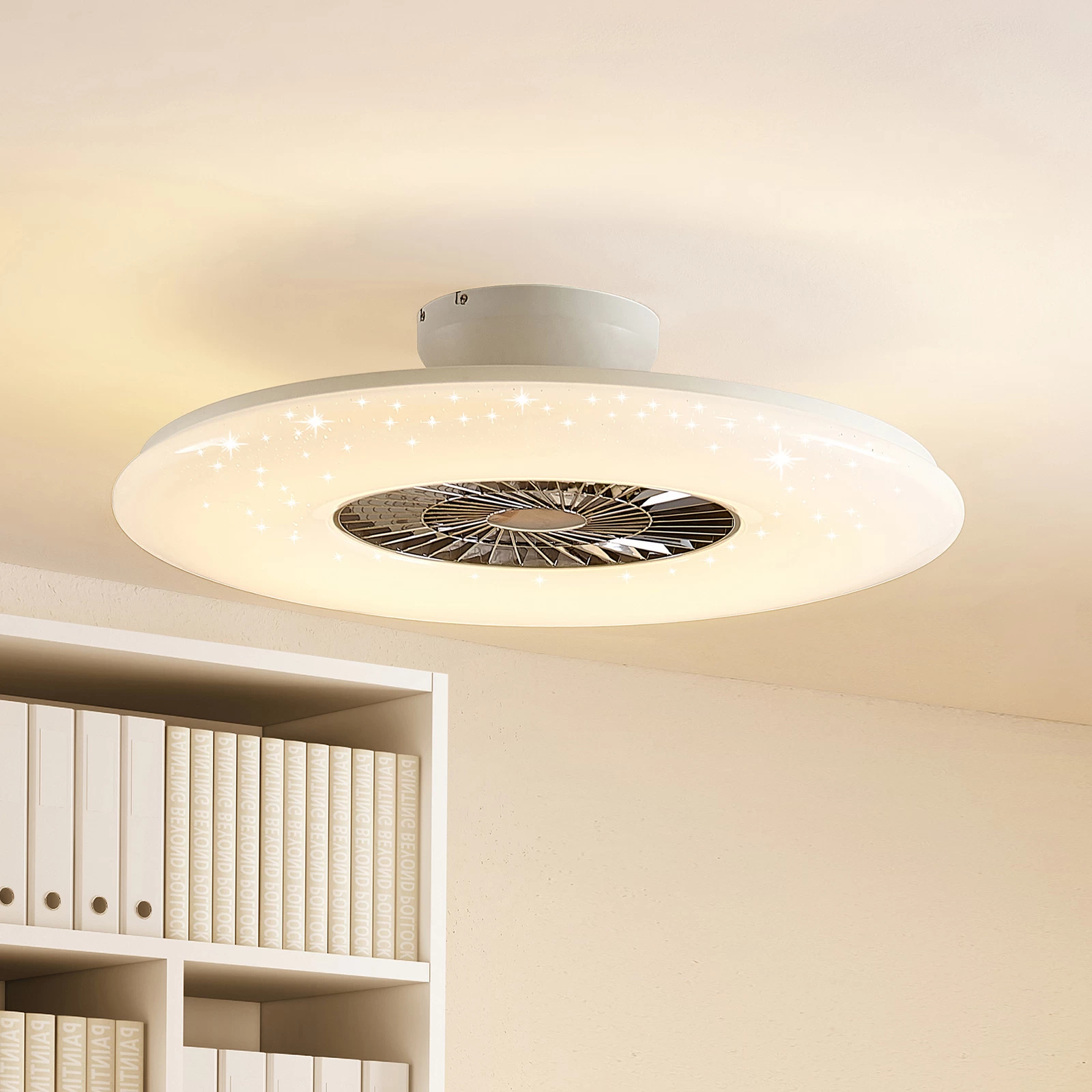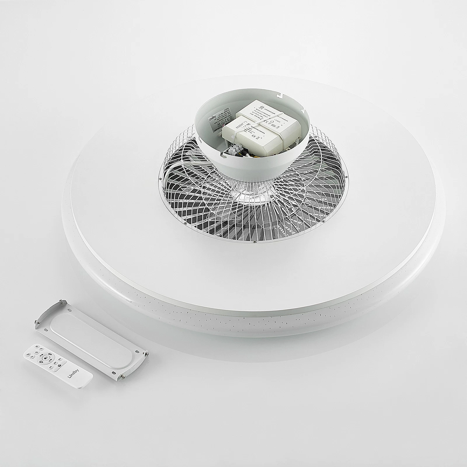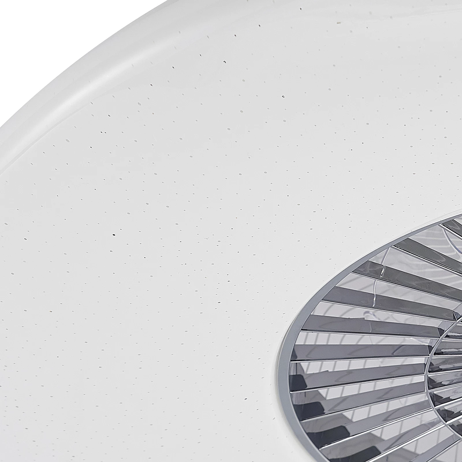 LED-loftventilator Klamina imponerer med et afrundet look i hvidt. Dækslet er lavet af hvid plast og fungerer også som en diffusor, så lyset fordeles blidt og jævnt i rummet.