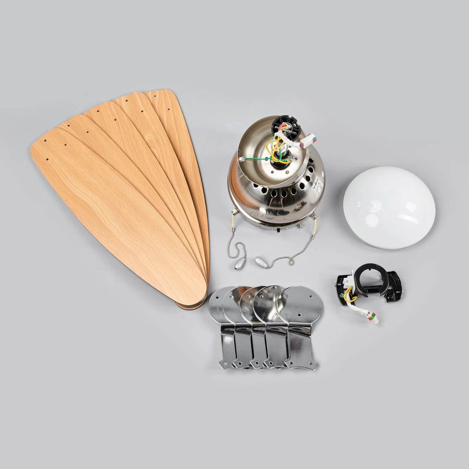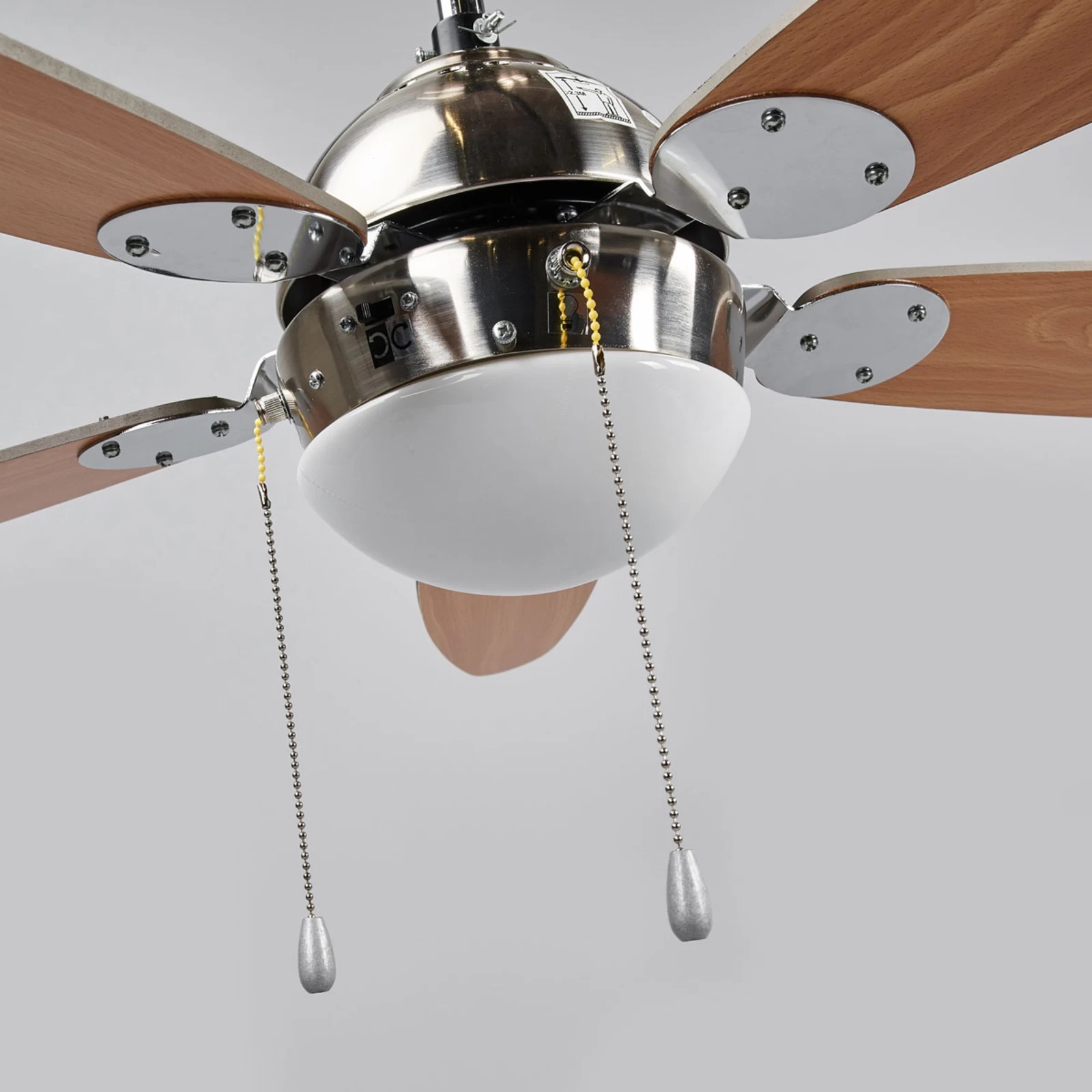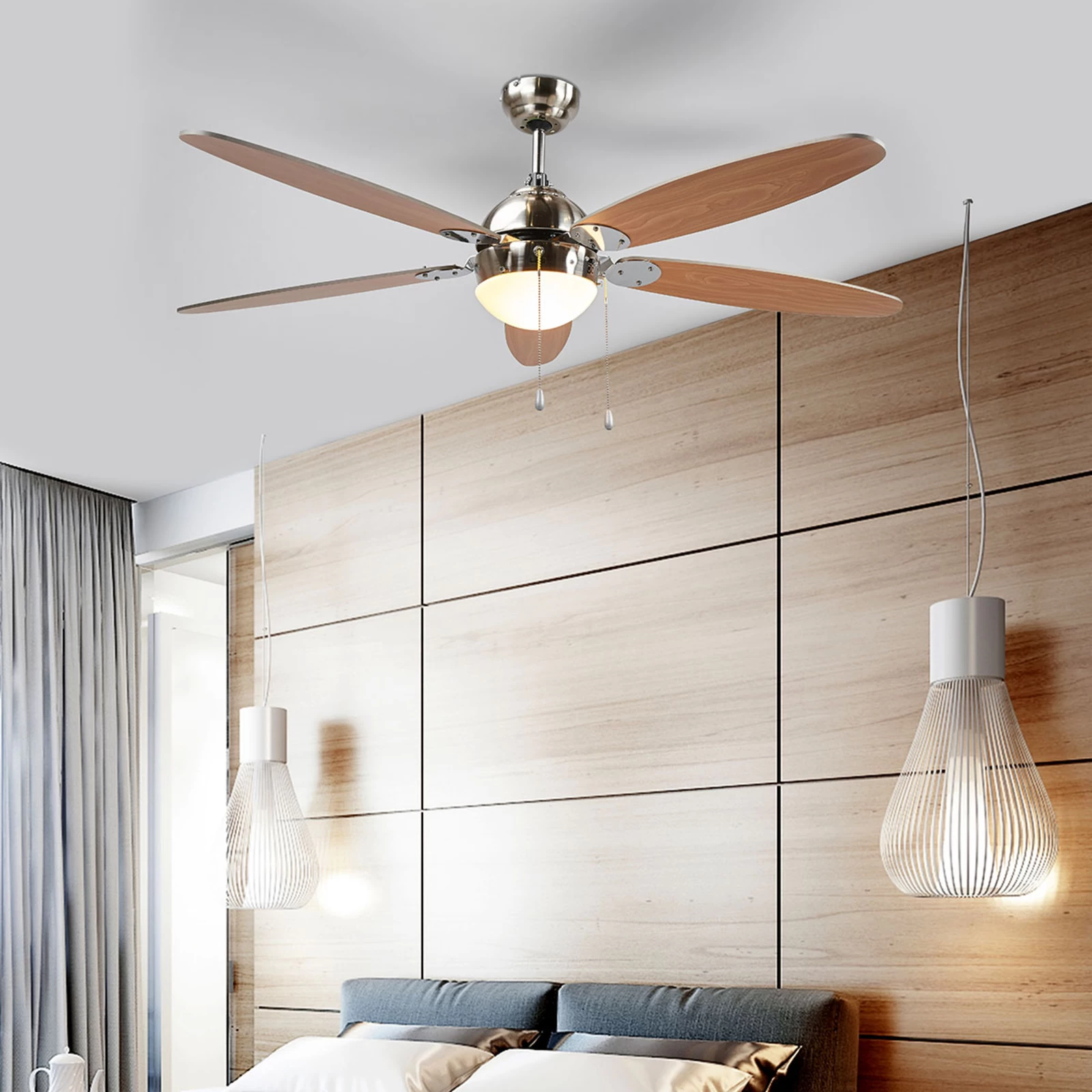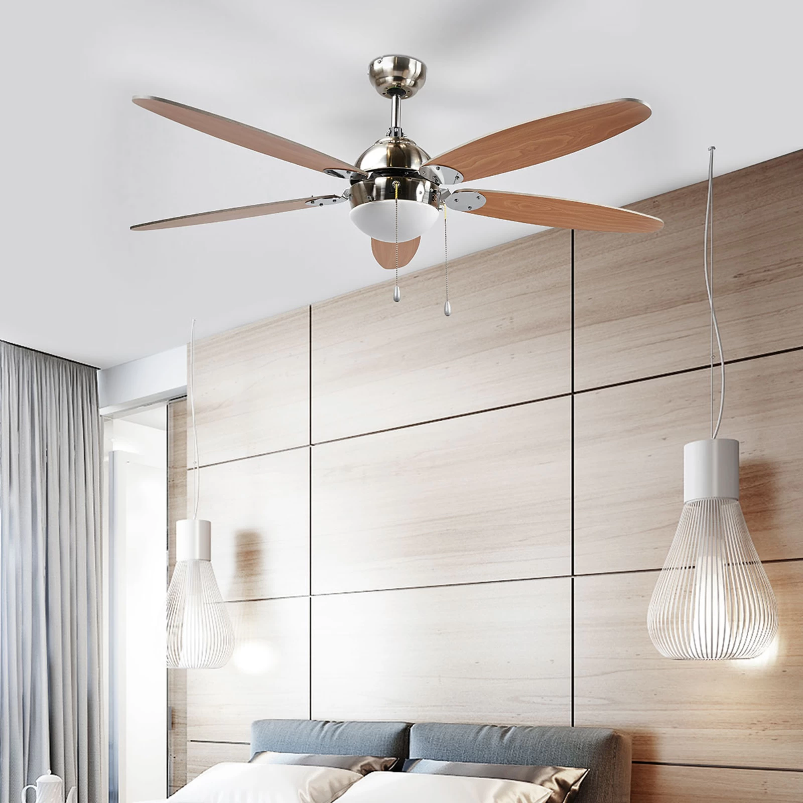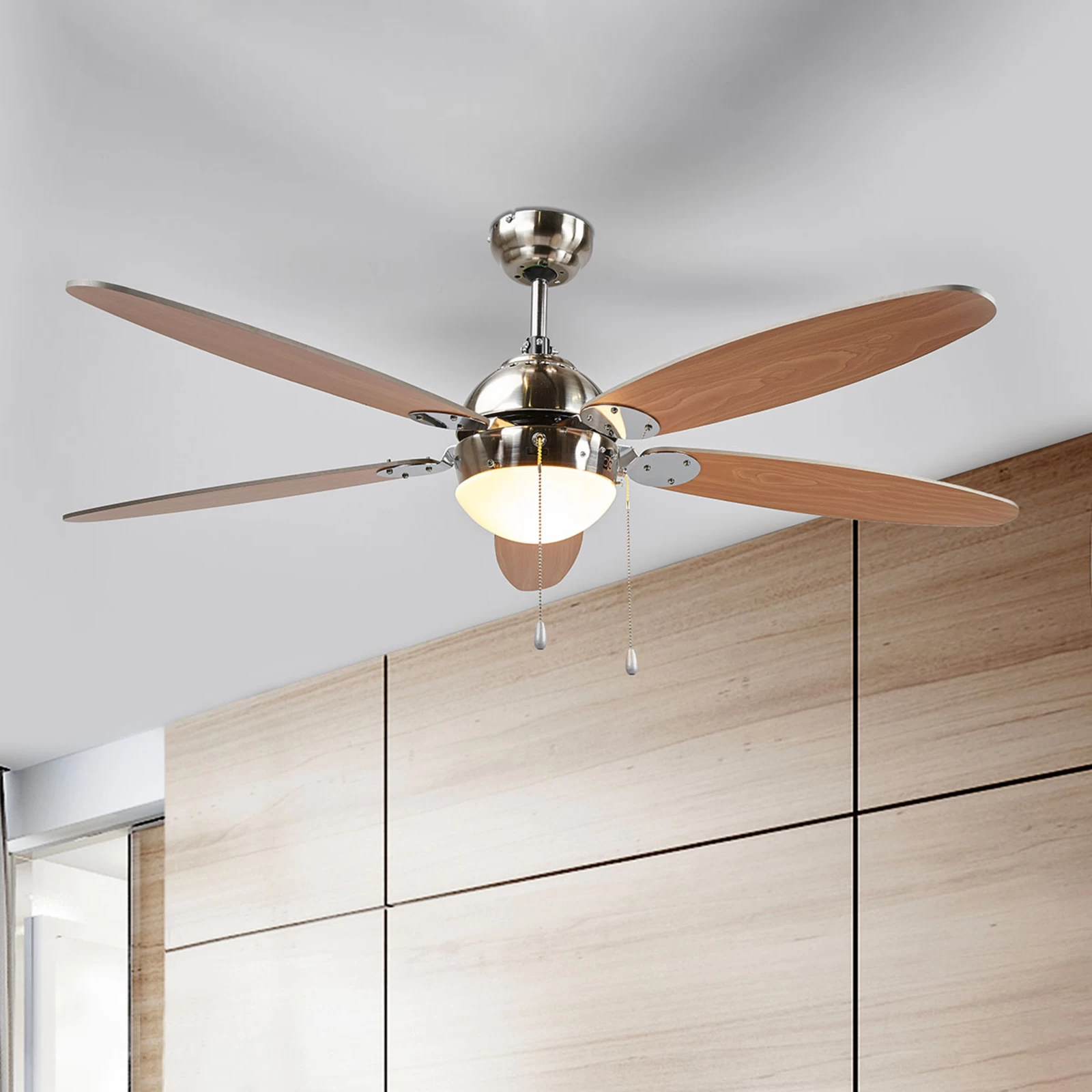 Den kan betjenes i tre hastigheder. Hastighedsfunktionen kan styres via trækkontakten. Desuden er der integreret en lyskilde, så du ikke har brug for to loftsforbindelser, men kan nemt kombinere begge funktioner.
