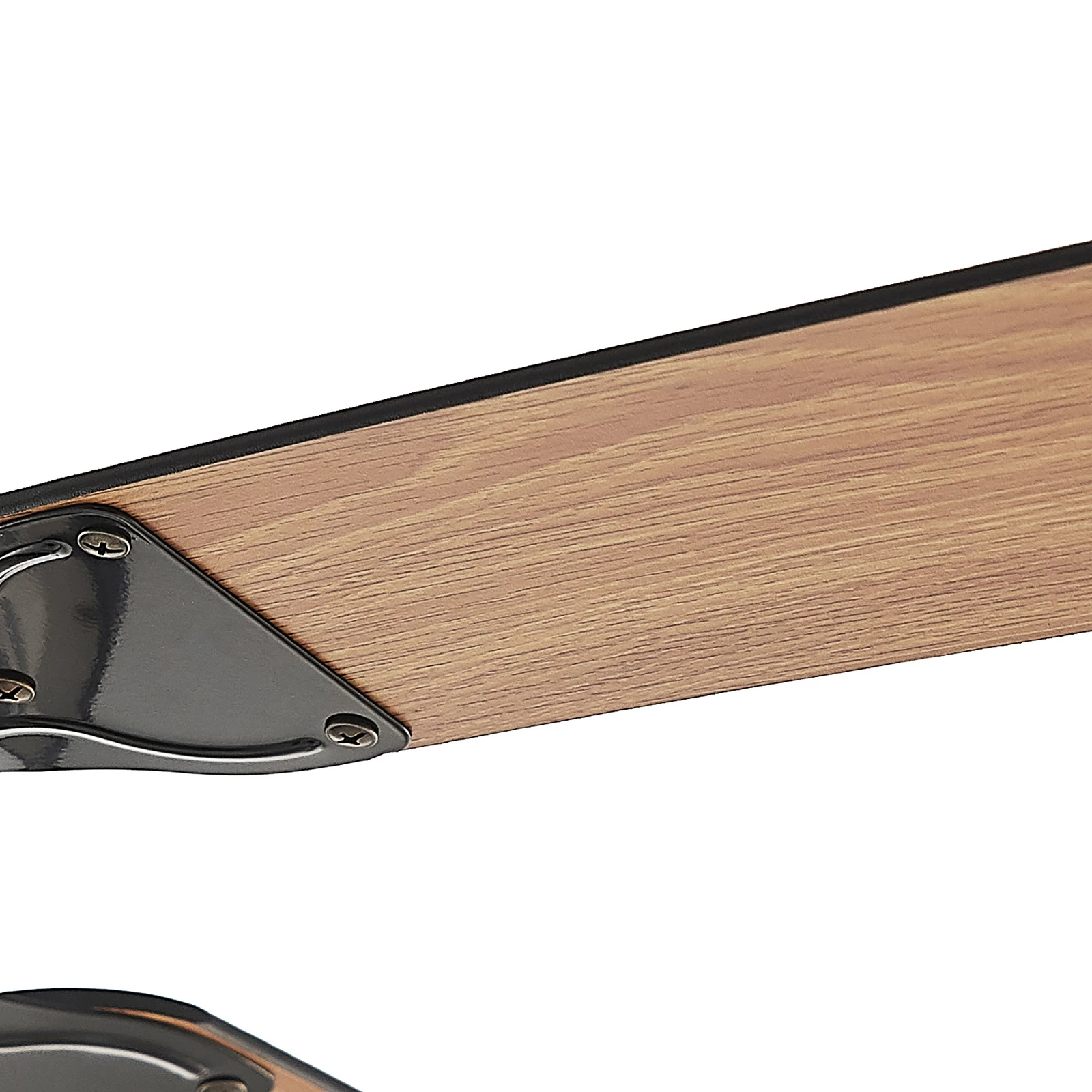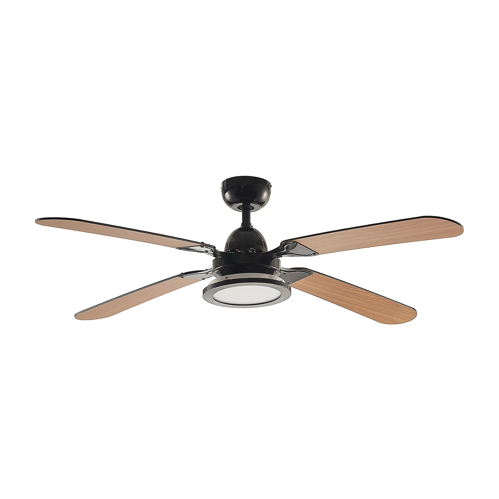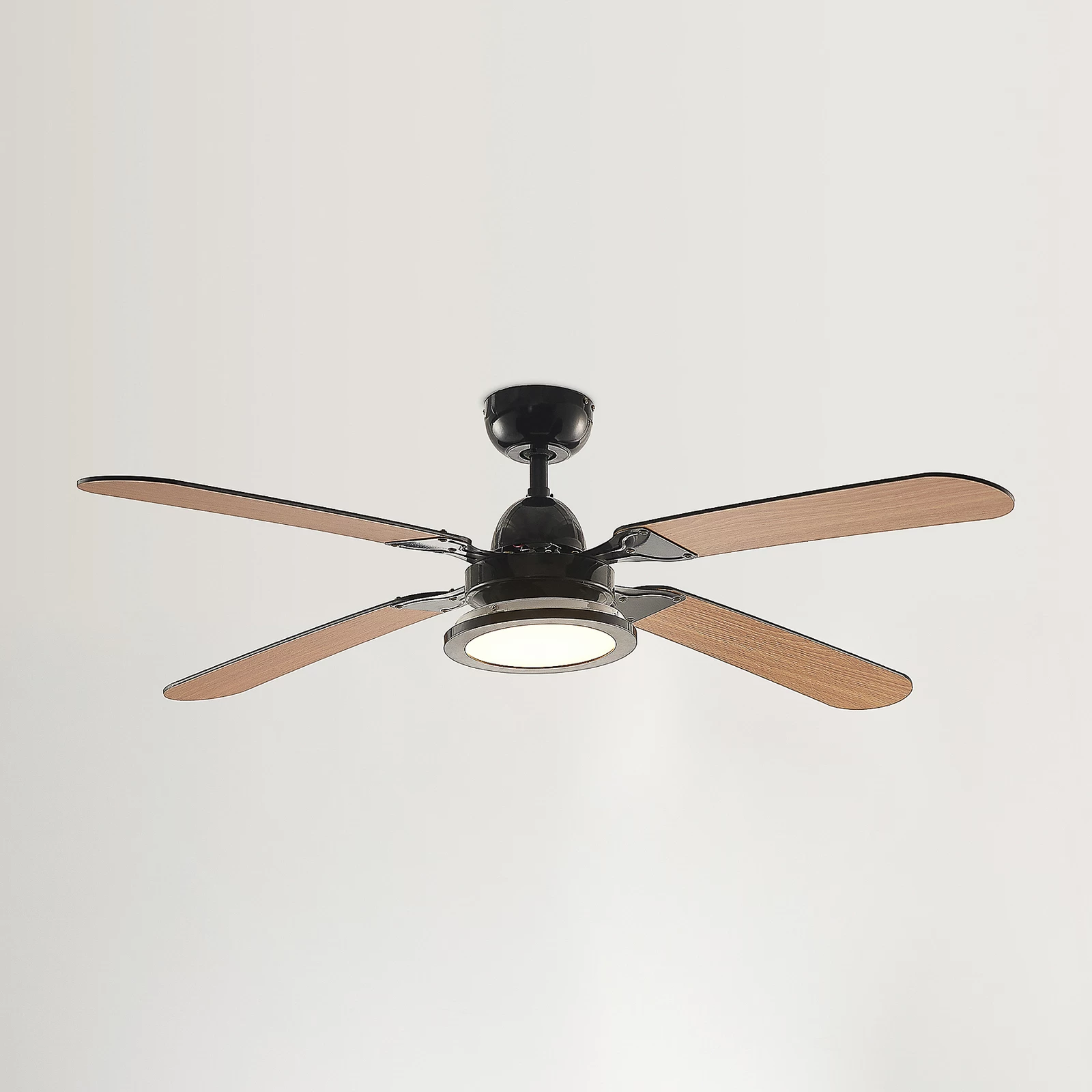De fire vinger på Tedric loftventilatoren er lavet af egetræ, og rammen er lavet af stål. Den attraktive farvekontrast mellem sort og lyst træ fuldender det markante design. Derudover har den fast installerede LED’er, der genererer varm hvid belysning, som er perfekt til indendørs brug