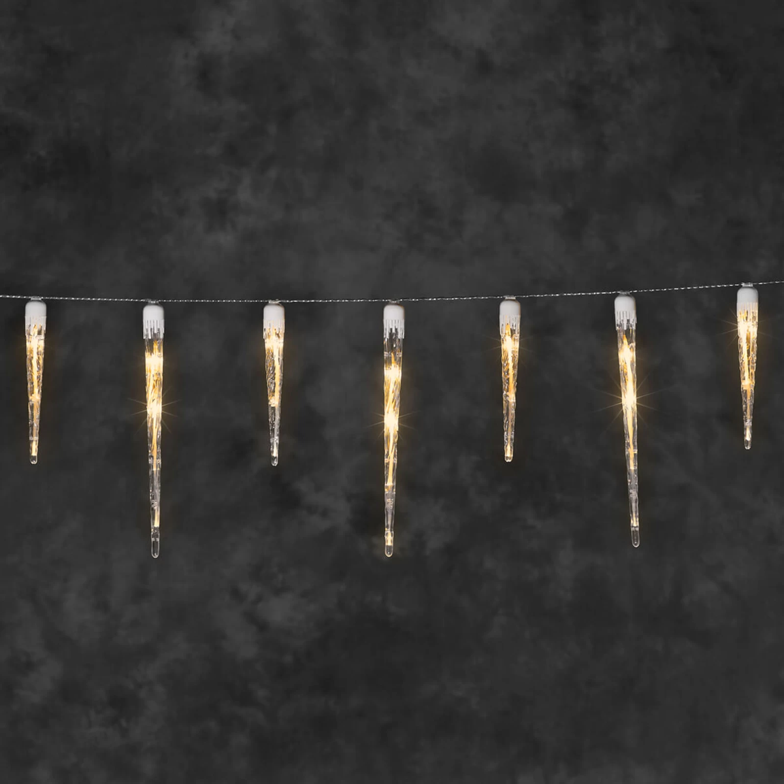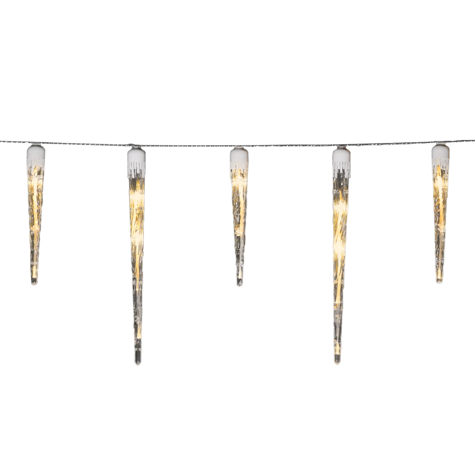 Skiftevis lange og korte istapper hænger ved siden af hinanden på denne lyskæde, som for eksempel kan bruges til stemningsfyldt at udsmykke boligens tagkant. Istapperne oplyses af LED-pærer i den meget varme lysfarve rav. Sådan opstår der en stemningsfuld atmosfære, som nok skal få forbipasserende og beboerne i julestemning. Kablet er hvidt. Transformator til udendørs brug medfølger.