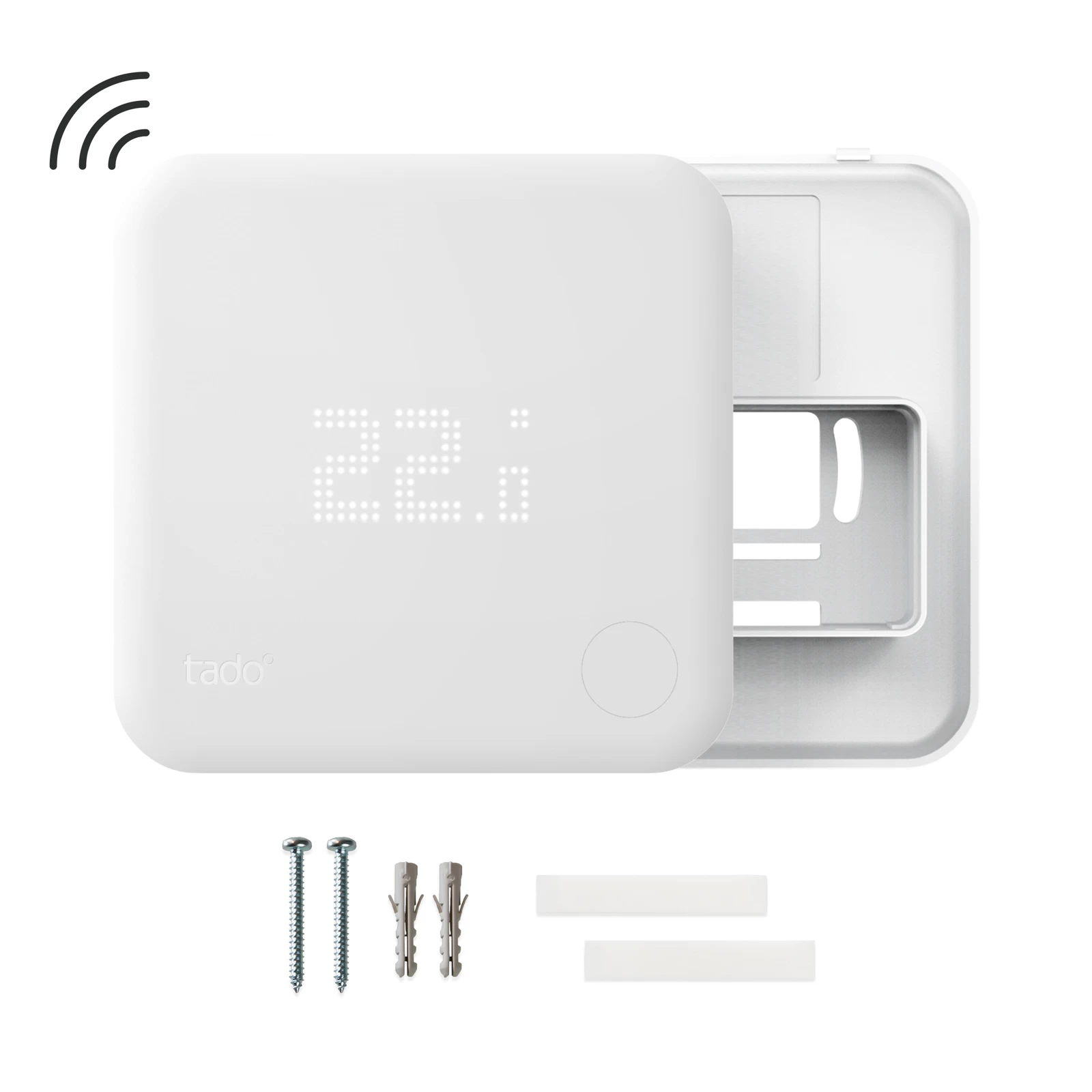 – Leveringsomfang: tado° radiotemperatursensor, 3 AAA-batterier, klæbepuder, monteringsmateriale