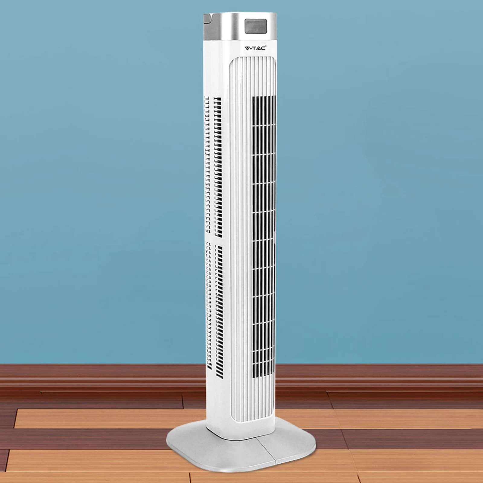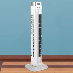 Den firkantede standventilator Tower giver en kølig brise på varme sommerdage. Ud over tre hastighedsniveauer, som kan indstilles enten ved hjælp af enhedens hoved eller ved hjælp af den medfølgende fjernbetjening, kan der indstilles forskellige tilstande (Normal / Natural / Sleep) og en timerfunktion (1 – 15 timer). Et display viser den aktuelle temperatur og den valgte hastighed.