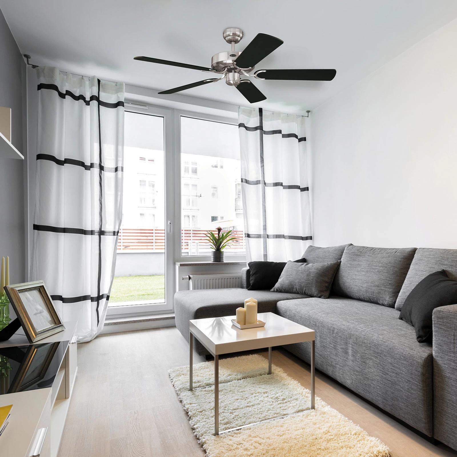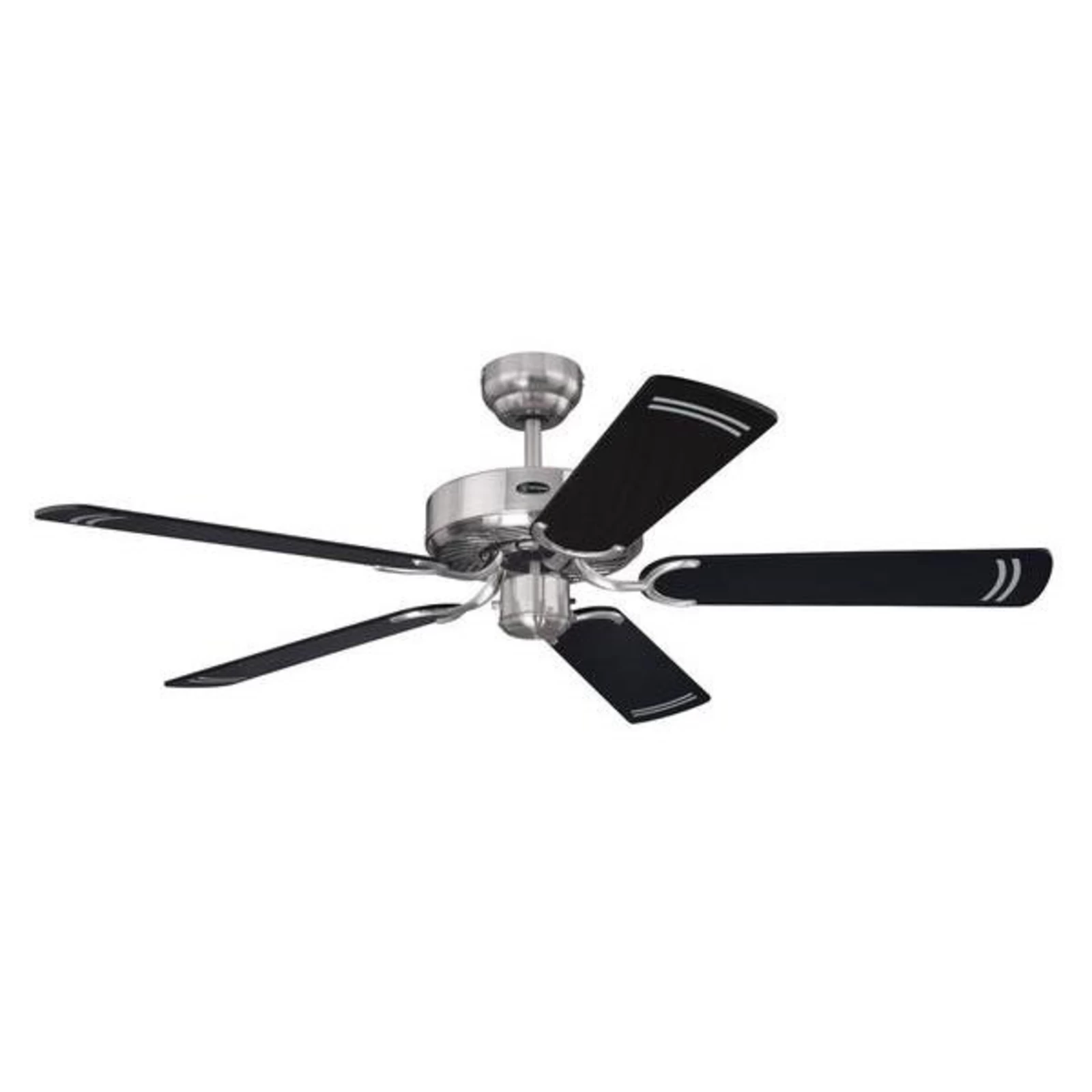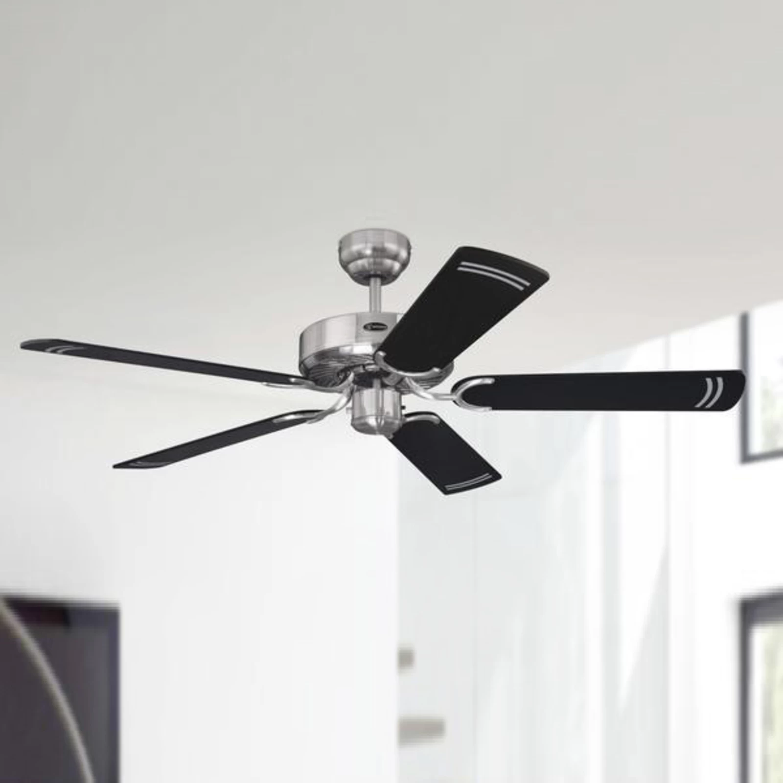 Den smukke Cyclone loftsventilator fra Westinghouse glæder sig over sit metalhus i børstet stållook. De fem vendbare blade – en side sort, en side sort-sølv – harmonerer perfekt med hinanden. Cyclone er velegnet til rum med op til 30 m² boligareal. Hvis loftet er højere end 3,50 meter, skal der anvendes en forlængerstang (se tilbehør).