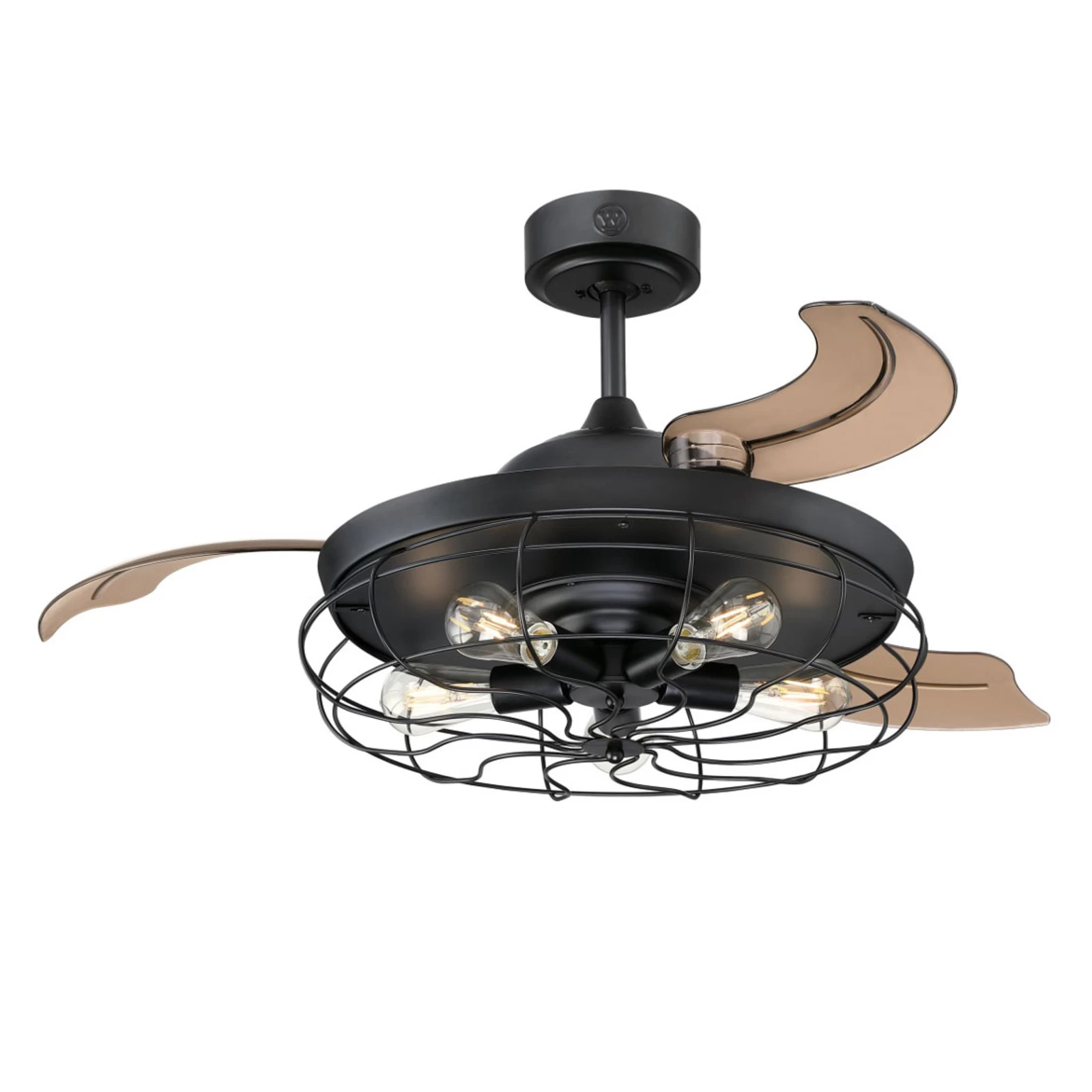 Loftventilator Dunlin i bur-design med tre med indtrækkelige blade og fem rustikke LED-lamper