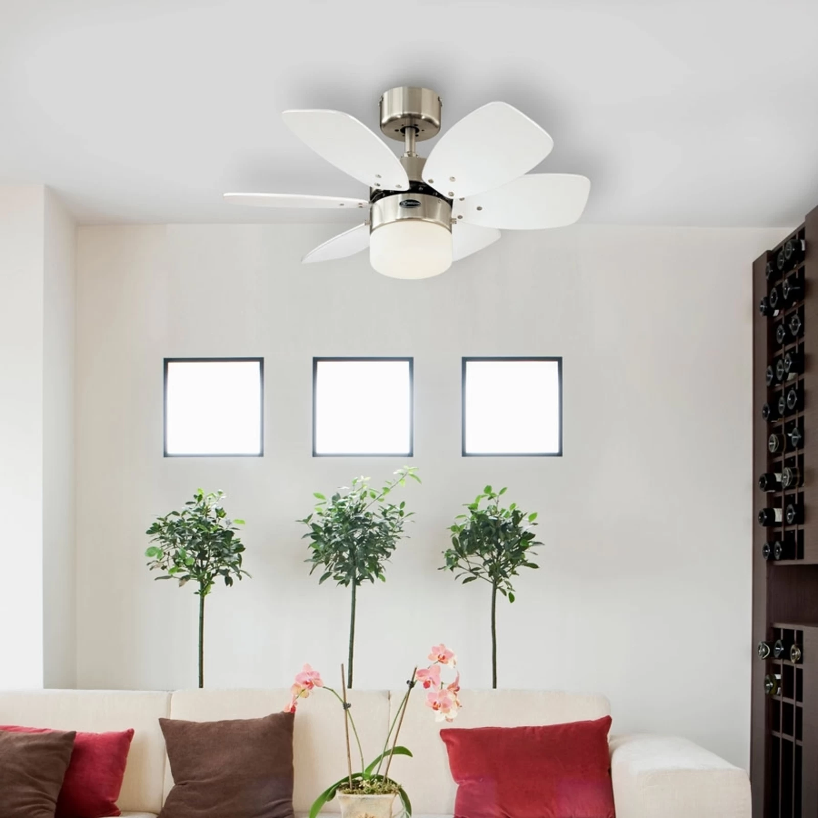 Udstyret til helårsbrug, dvs. udstyret med sommer- og vinterfunktioner. Om sommeren bliver luften i rummet frisket op, og om vinteren sørger Floral Royal loftventilatoren for behagelige temperaturforhold og en velkommen reduktion af energiomkostningerne ved at fordele den opvarmede luft.