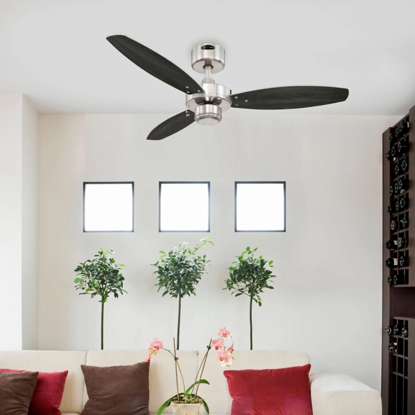 Bemærk: Denne loftventilator kan rotere både med og mod uret (dette kan indstilles vha. en skydekontakt på kabinettet) og er således egnet til brug om sommeren og om vinteren. Den sparer nemlig op til 30 % af varmeudgifterne om vinteren og sørger for en frisk brise om sommeren.