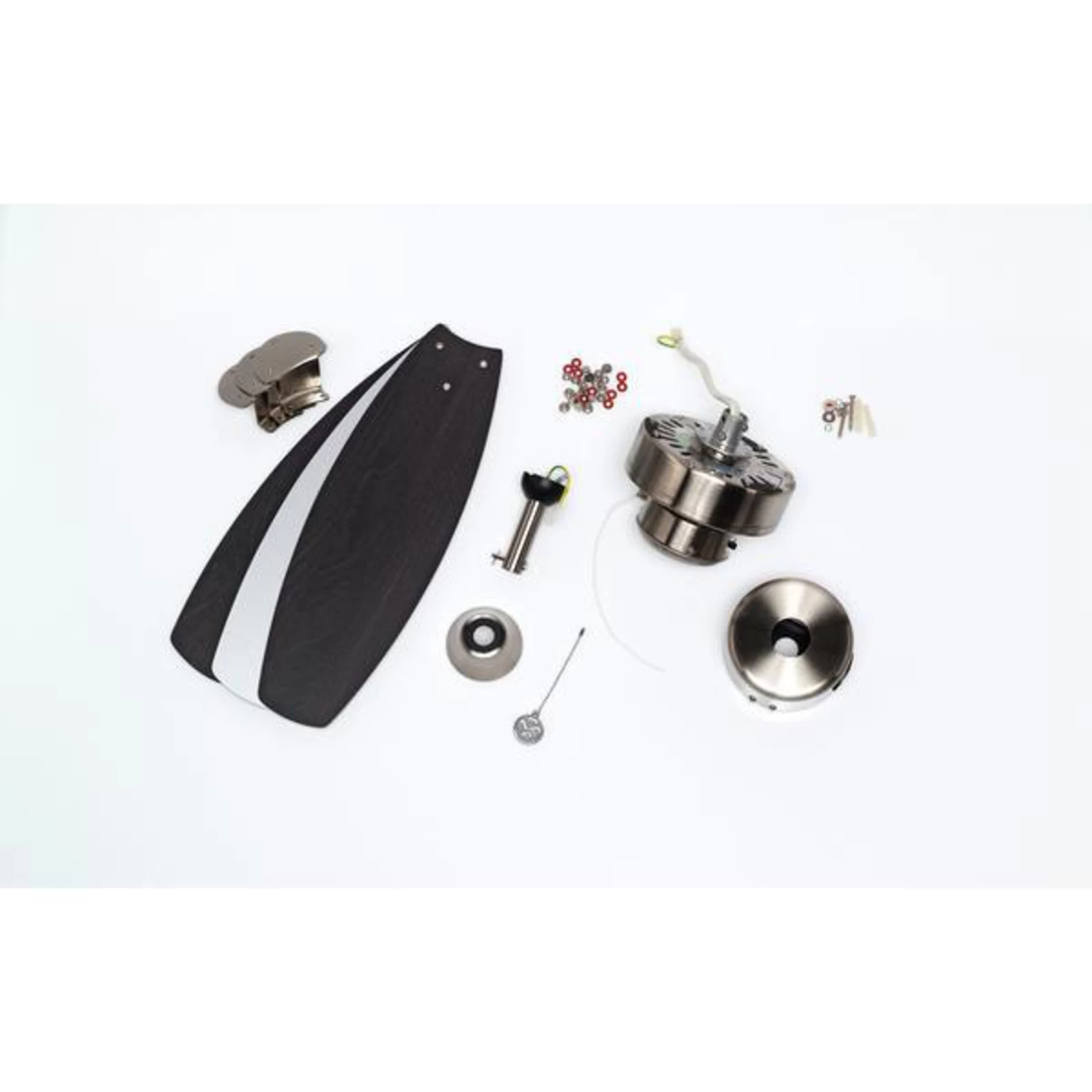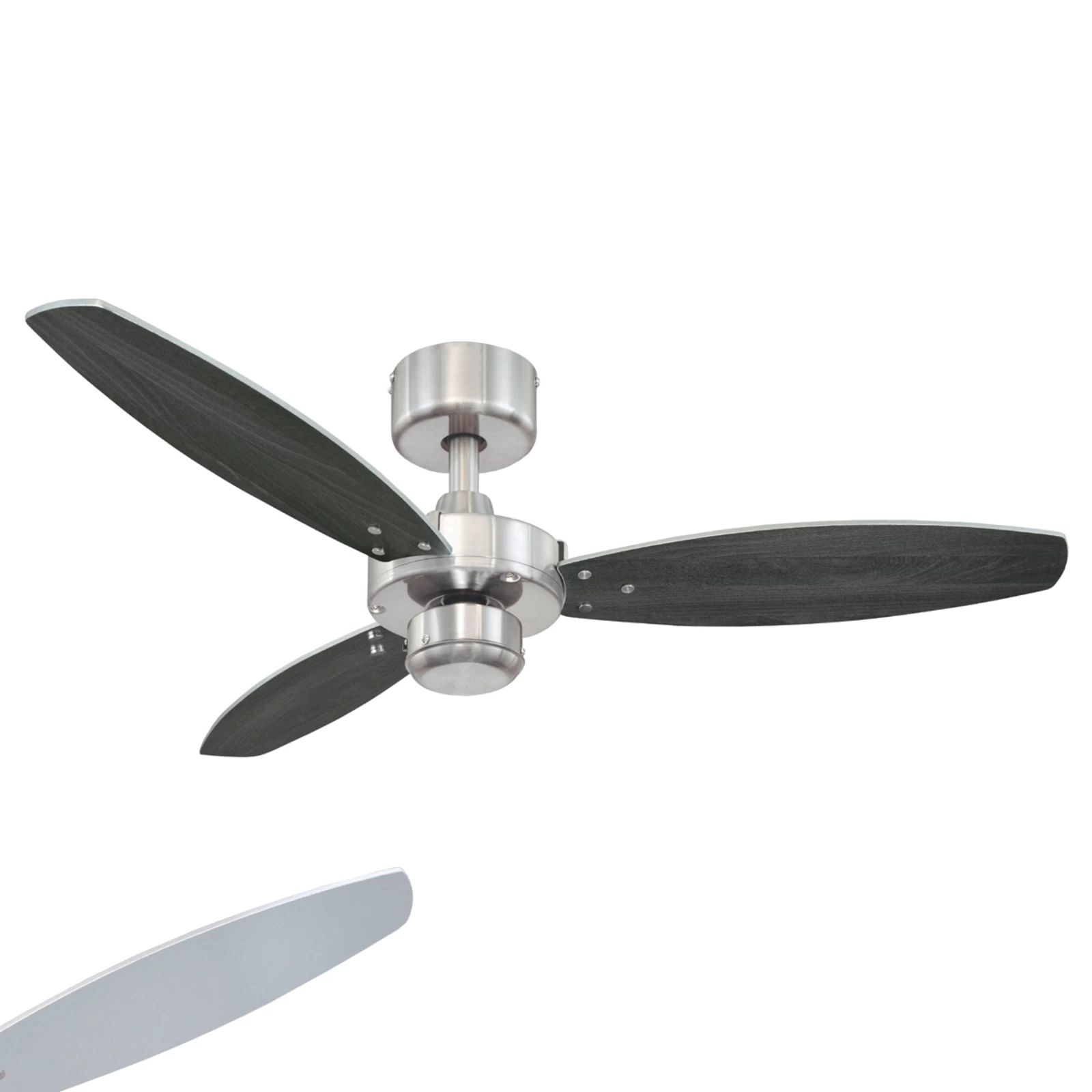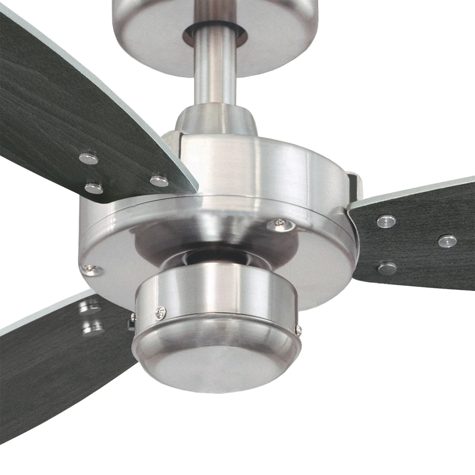 Loftventilatoren Jet I i børstet nikkel og med udskiftelige vinger i wenge- og sølvfarve, diameter 105 cm