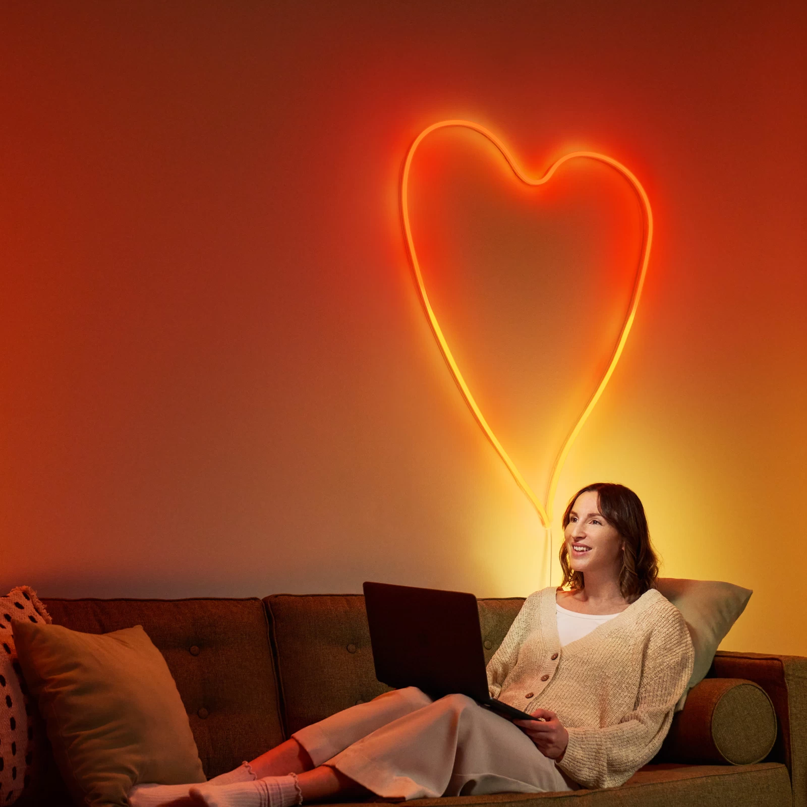 Smart styrbar omgivelsesbelysning takket være WiZ-teknologi – RGB LED-strip Neon FlexDen fleksible LED-strip Neon Flex giver en homogen lyslinje i alle farvenuancer til tørre indendørs områder. Båndet kan ikke kun lyse i en ensartet farve, men også vise forskellige farvenuancer i sektioner. Takket være den indbyggede WiZ-teknologi kan Neon Flex forbindes til en smartphone/tablet via WLAN og styres med den tilhørende WiZ-app. Derudover er betjening via WiZ-vægkontakten eller WiZ-fjernbetjeningen også mulig (se tilbehør).Tekniske data / kompatibilitet:- kan integreres via WLAN; bro eller gateway er ikke nødvendig- inkluderer stik og strømforsyningsenhed til strømforsyning via stikkontakten- kan styres med smartphone eller tablet med WiZ-app til iOS (fra version 11.0) og Android (fra version 4.4) på stedet eller fra vejen (internetforbindelse kræves)- 16 millioner farvenuancer- kan dæmpes via WiZ-appen (se tilbehør). app-funktioner: direkte omskiftning og dæmpning; lagring af populære scener via kamerasnapshot; tildeling af armaturer til rum/grupper; oprettelse af tidsplaner; valg af forudindstillede lystilstande/scener; tildeling af flere brugere og tildeling af adgangsrettigheder; betjening af op til 10. 000 WiZ-lamper.000 WiZ-lamper- kan styres med WiZ-fjernbetjening (se tilbehør)- to favoritfunktioner kan tildeles den konventionelle kontakt via app (WiZclick)- stemmestyring, når den er integreret med Google Home, Amazon Alexa (Amazon-webtjenester abonneres i lampens levetid) eller Apple HomeKit- Matter-certificeret- integration i IFTTT til kobling med yderligere smarte enheder